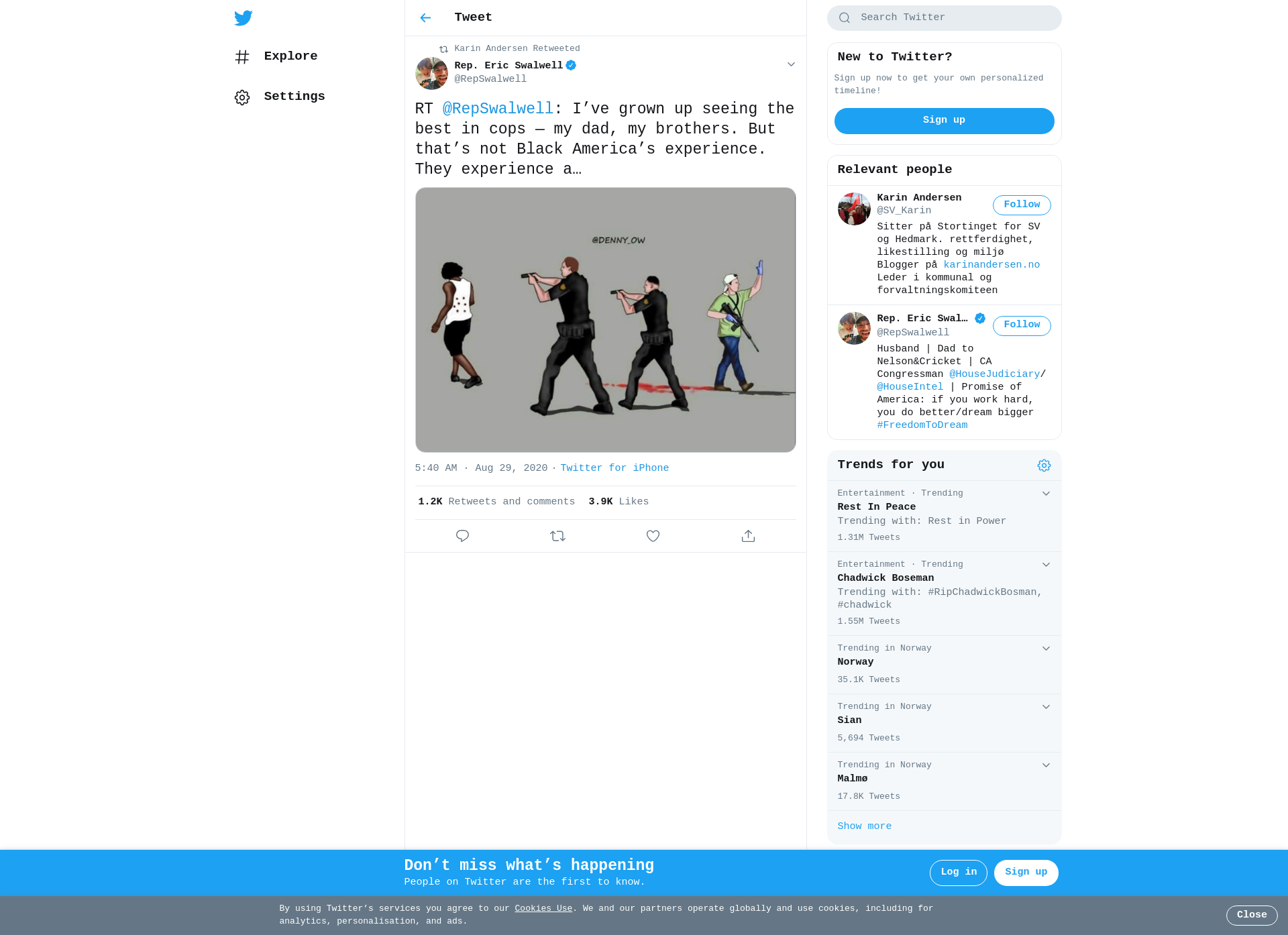 RT @RepSwalwell: I’ve grown up seeing the best in cops — my dad, my brothers. But that’s not Black America’s experience. They experience a disproportionate amount of killings by police. This art piece says it all: America has two systems of justice. We must change that. #blacklivesmatter https://t.co/1rLYsOFnix