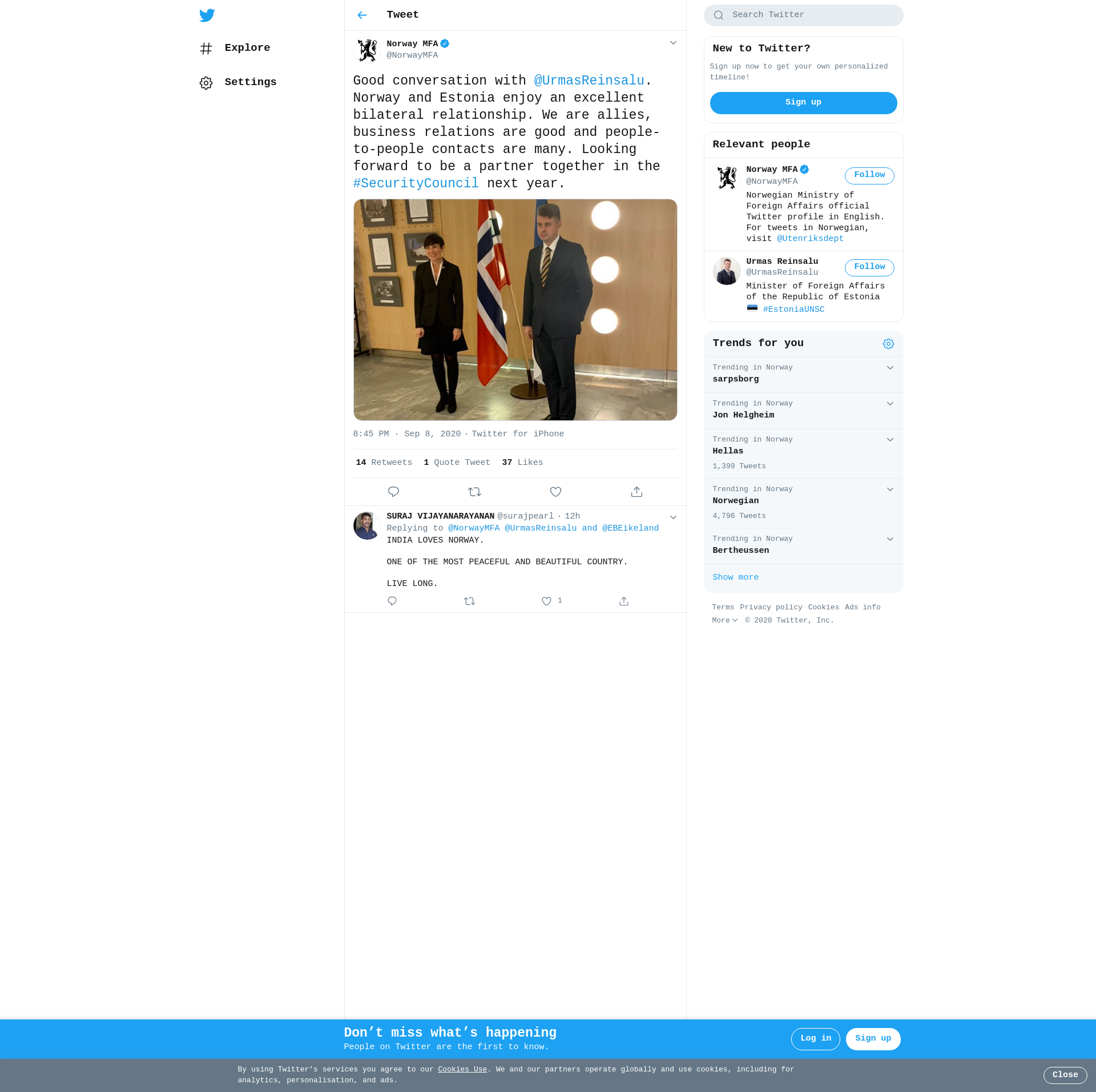 Good conversation with @UrmasReinsalu. Norway and Estonia enjoy an excellent bilateral relationship. We are allies, business relations are good and people-to-people contacts are many. Looking forward to be a partner together in the #SecurityCouncil next year. https://t.co/4rcZs9Z5dC
