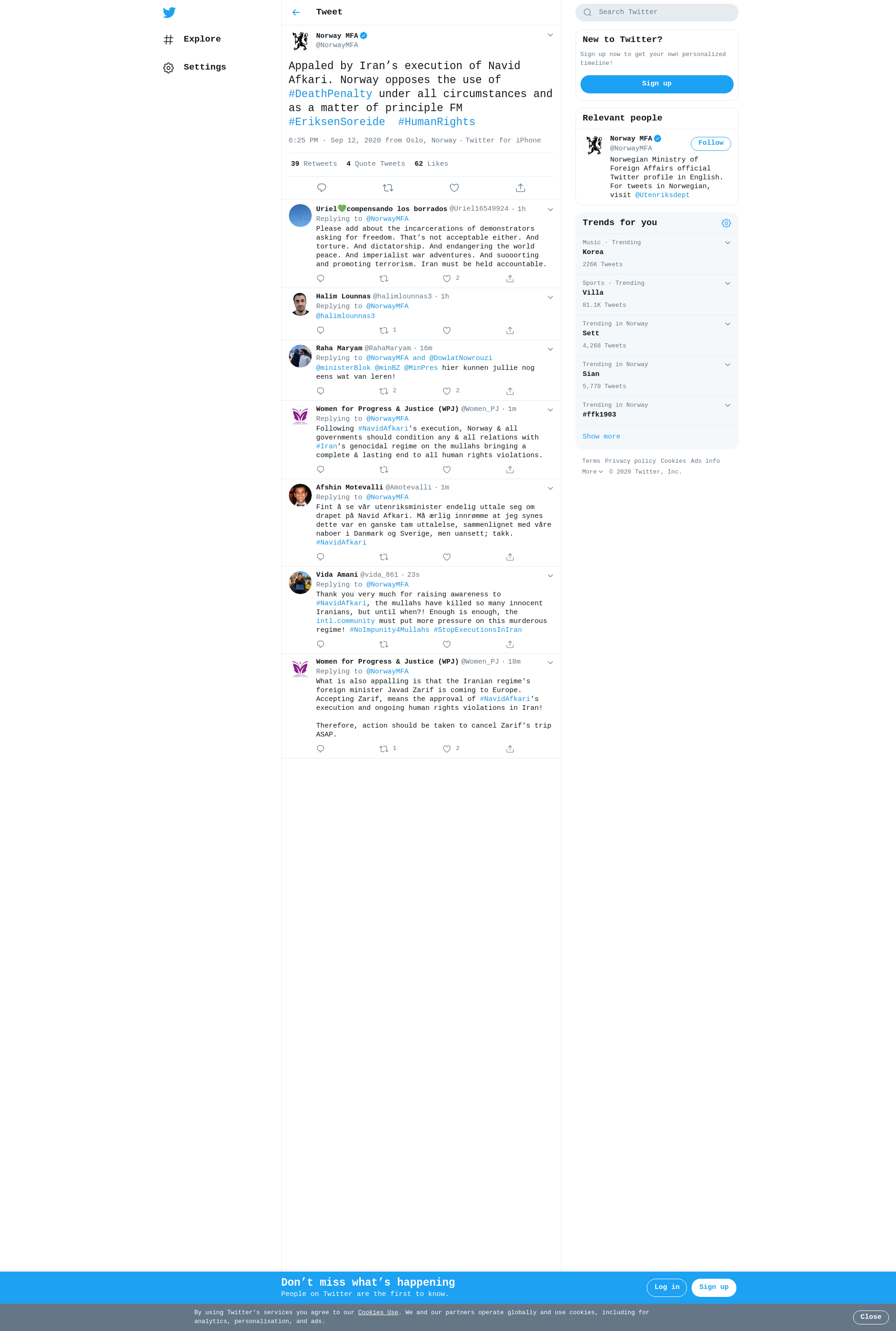 Appaled by Iran’s execution of Navid Afkari. Norway opposes the use of #DeathPenalty under all circumstances and as a matter of principle FM #EriksenSoreide #HumanRights