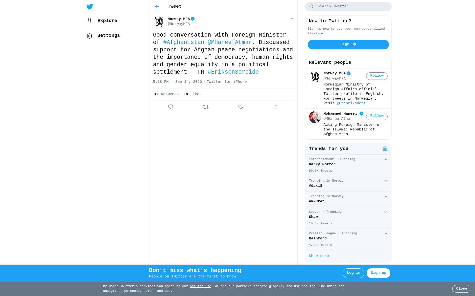 Good conversation with Foreign Minister of #Afghanistan @MHaneefAtmar. Discussed support for Afghan peace negotiations and the importance of democracy, human rights and gender equality in a political settlement - FM #EriksenSoreide