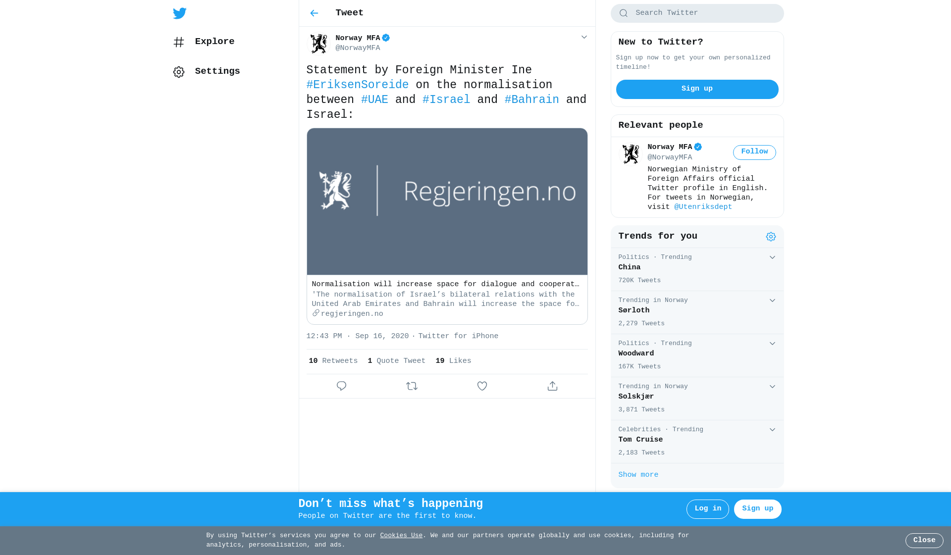 'The normalisation of Israel’s bilateral relations with the United Arab Emirates and Bahrain will increase the space for dialogue and cooperation between Israel and the Arab world. It is positive if this can contribute to increased political stability ...