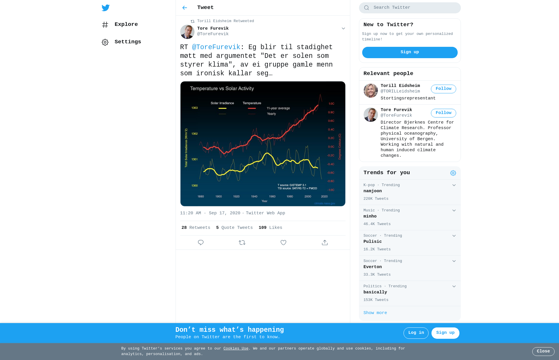 RT @ToreFurevik: Eg blir til stadighet møtt med argumentet "Det er solen som styrer klima", av ei gruppe gamle menn som ironisk kallar seg klimarealistar @KRmgr1. Nei, små variasjonar i energien frå sola kan ikkje forklare at det blir varmare, og nei, me er ikkje på vei inn i ei ny lille istid. https://t.co/oxB7IWbbA3