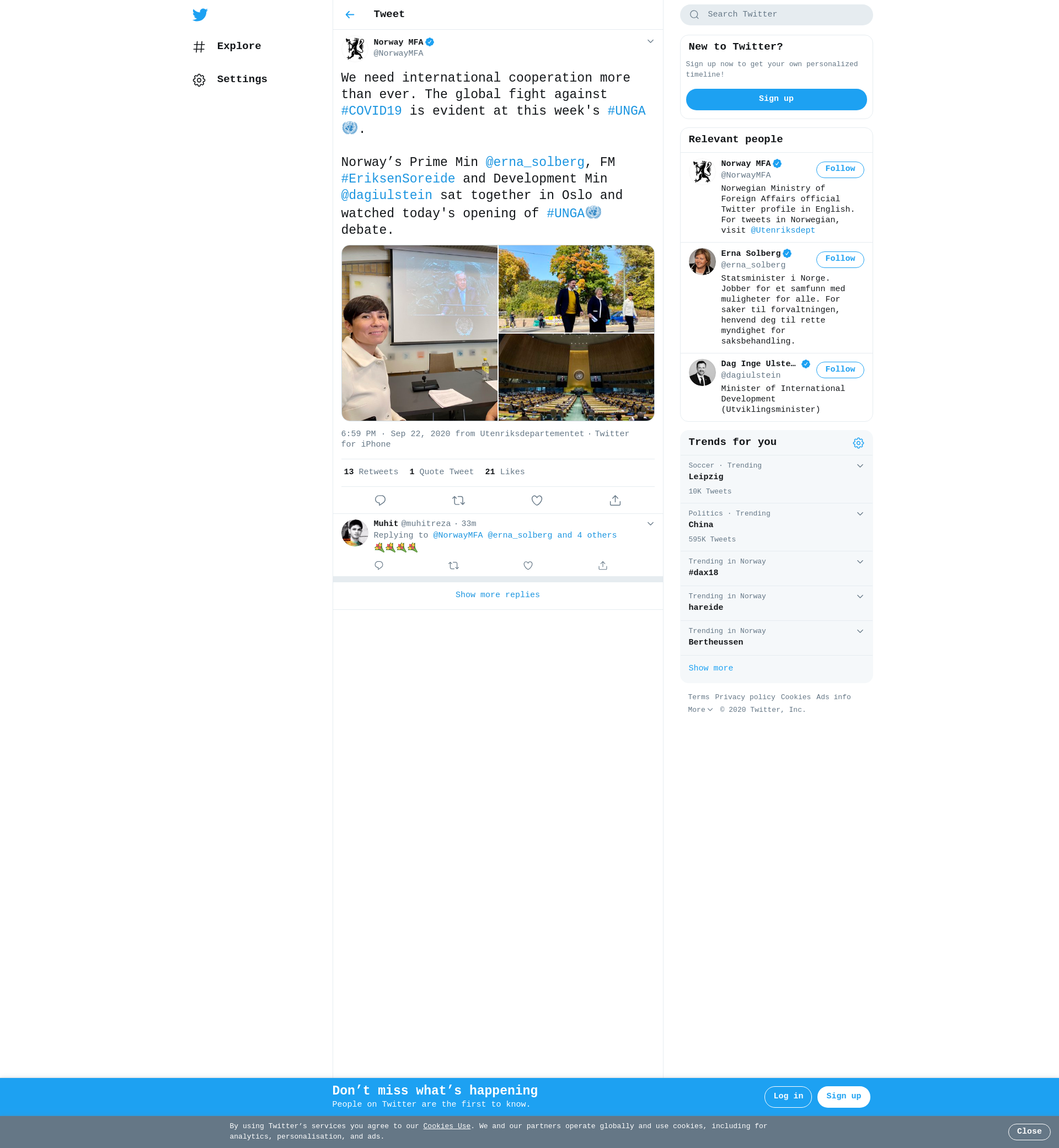 Norway’s Prime Min @erna_solberg, FM #EriksenSoreide and Development Min @dagiulstein sat together in Oslo and watched today's opening of #UNGA debate. https://t.co/31YntpLI7c