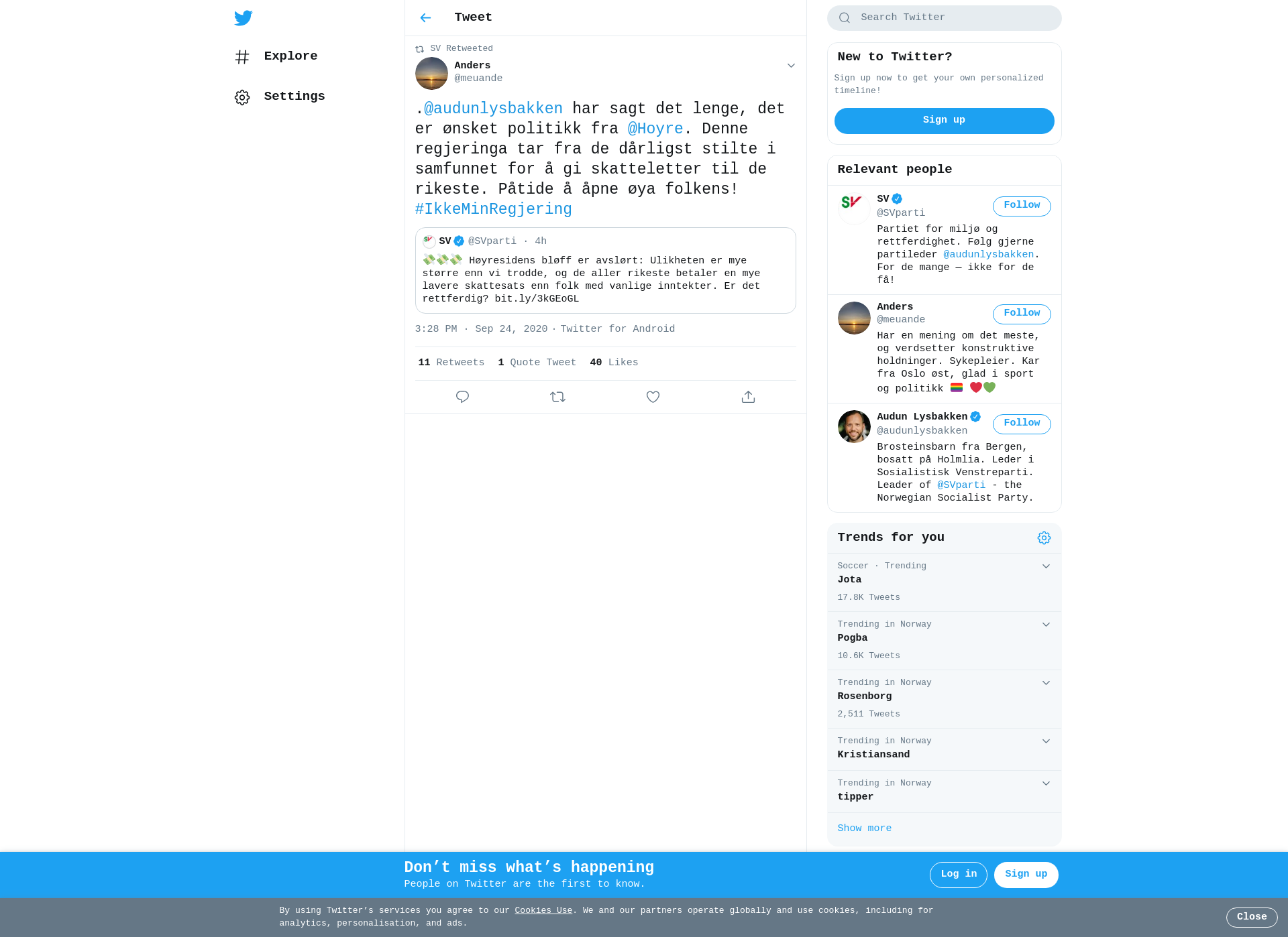 RT @meuande: .@audunlysbakken har sagt det lenge, det er ønsket politikk fra @Hoyre. Denne regjeringa tar fra de dårligst stilte i samfunnet for å gi skatteletter til de rikeste. Påtide å åpne øya folkens! #IkkeMinRegjering https://t.co/x0XGI06O1L