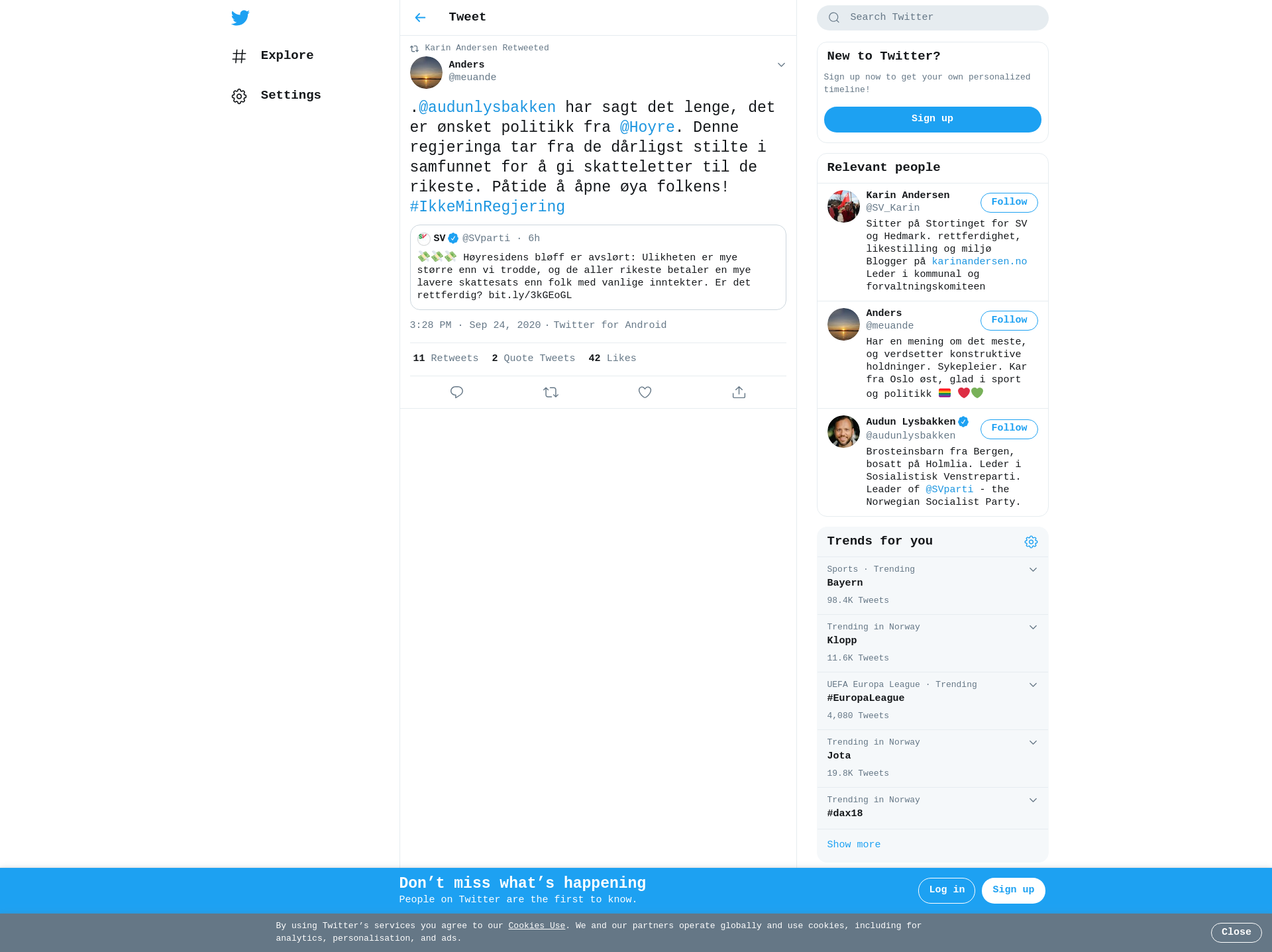 RT @meuande: .@audunlysbakken har sagt det lenge, det er ønsket politikk fra @Hoyre. Denne regjeringa tar fra de dårligst stilte i samfunnet for å gi skatteletter til de rikeste. Påtide å åpne øya folkens! #IkkeMinRegjering
