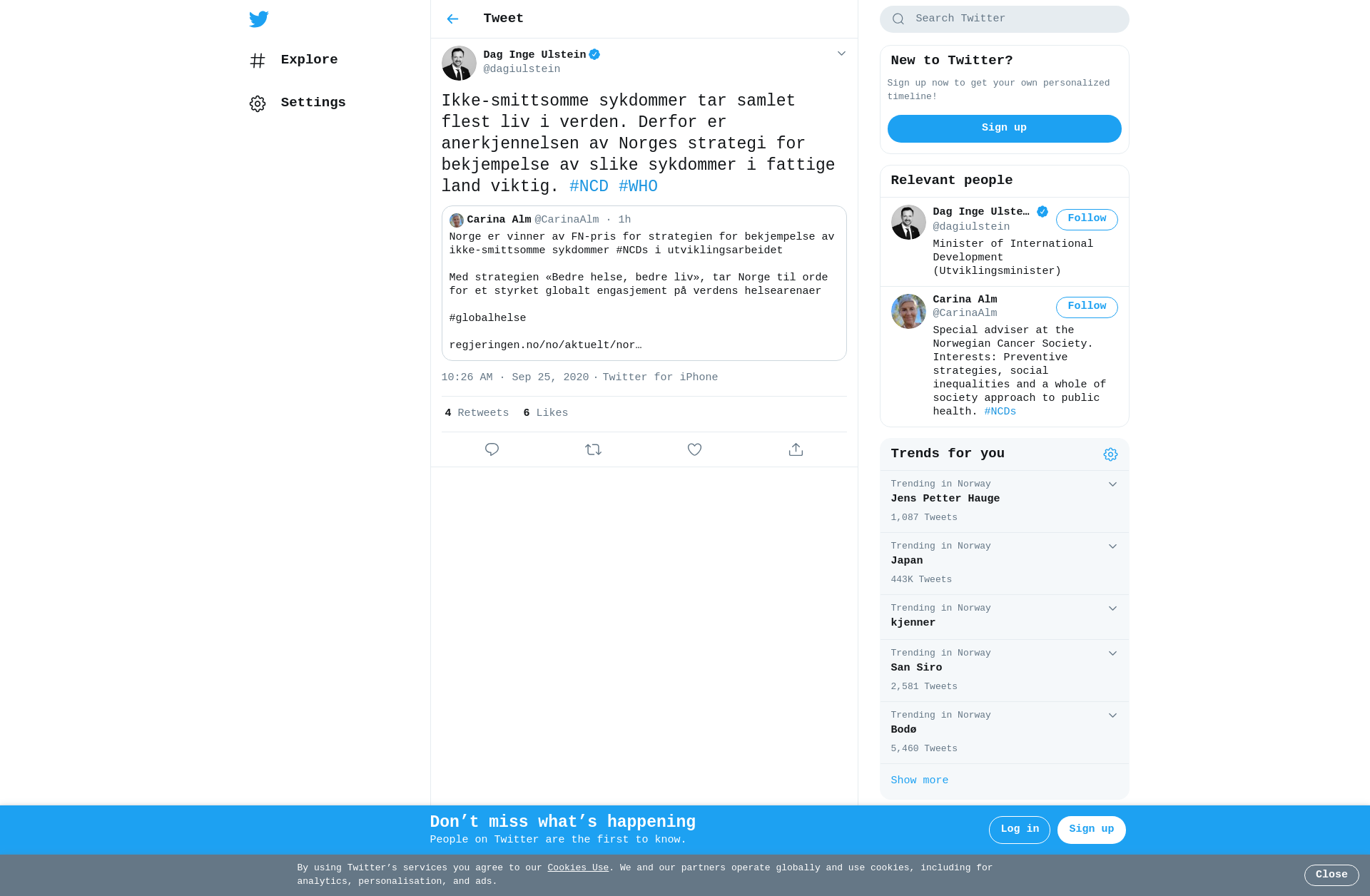 Ikke-smittsomme sykdommer tar samlet flest liv i verden. Derfor er anerkjennelsen av Norges strategi for bekjempelse av slike sykdommer i fattige land viktig. #NCD #WHO