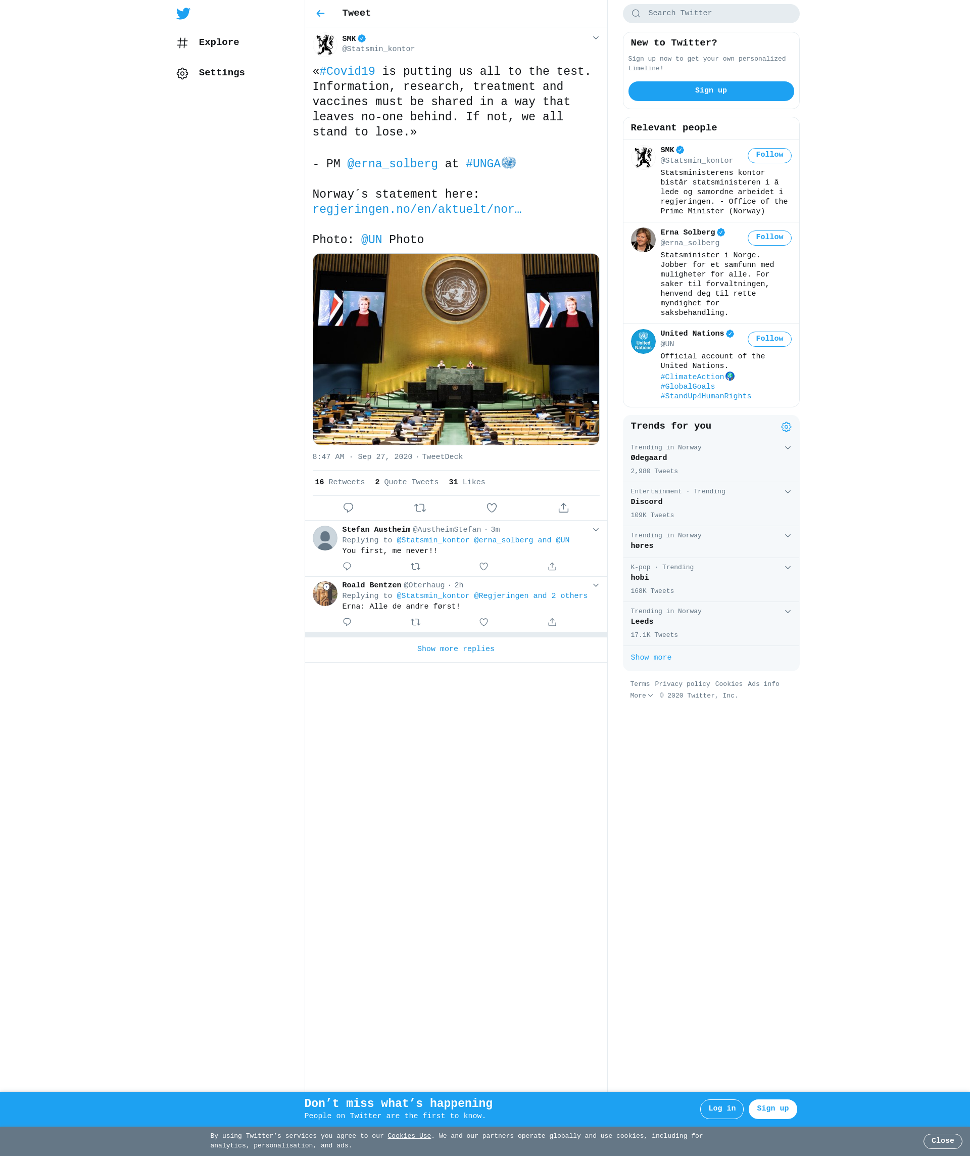 Statement by Prime Minister Erna Solberg, United Nations, New York, 27 September 2019.