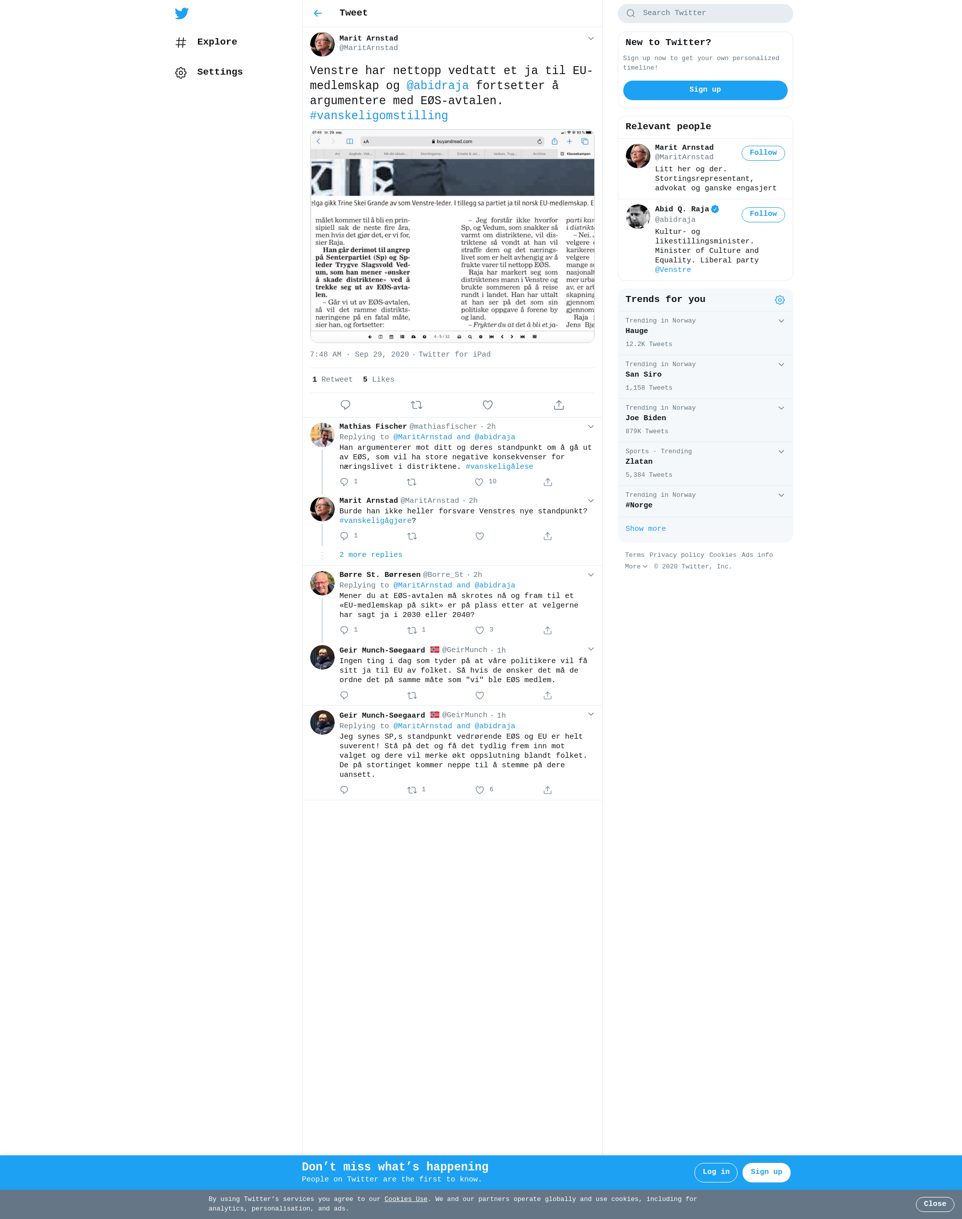 Venstre har nettopp vedtatt et ja til EU-medlemskap og @abidraja fortsetter å argumentere med EØS-avtalen. #vanskeligomstilling https://t.co/TvN147jCKZ