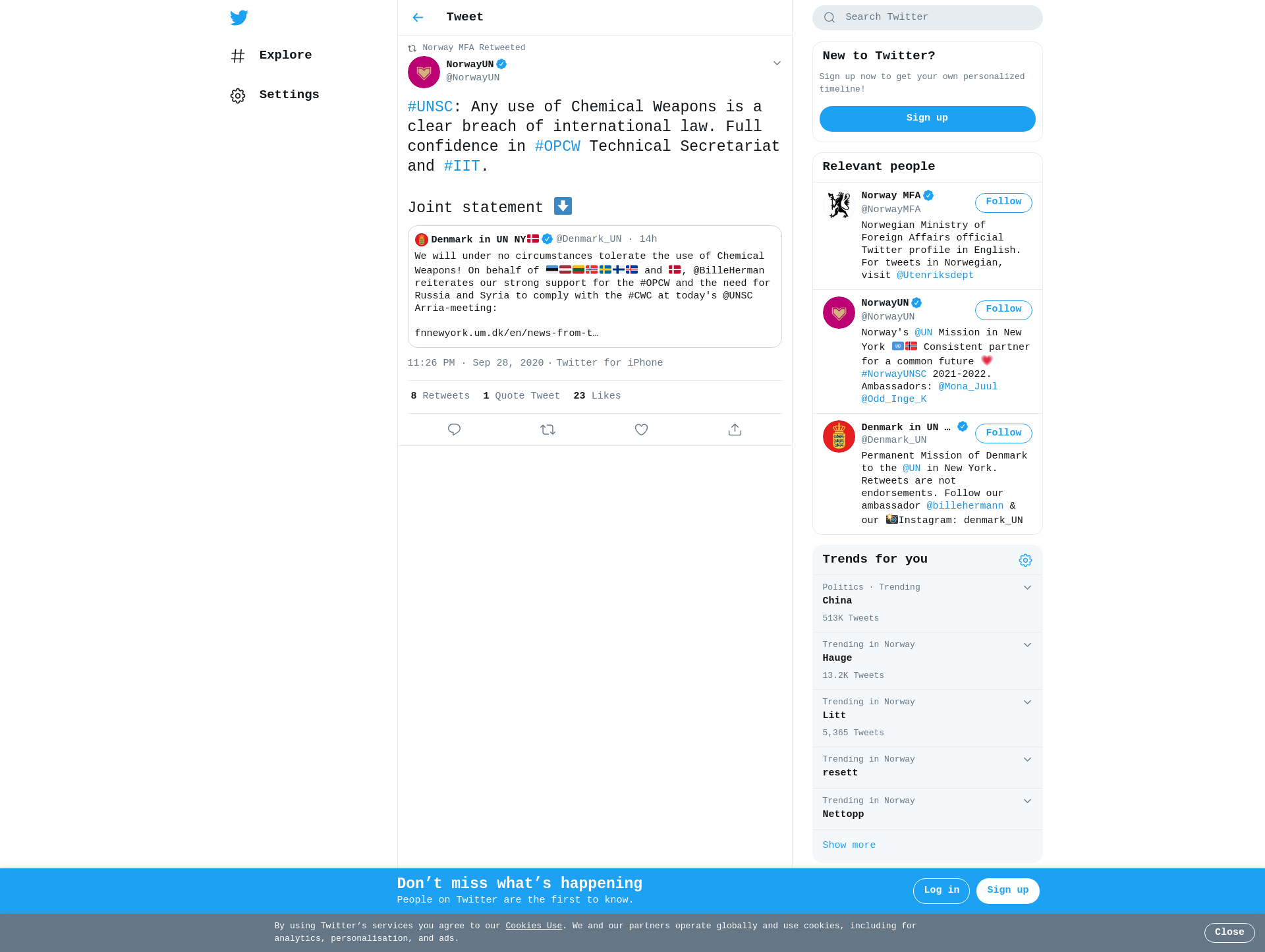 RT @NorwayUN: #UNSC: Any use of Chemical Weapons is a clear breach of international law. Full confidence in #OPCW Technical Secretariat and #IIT. Joint statement ⬇️