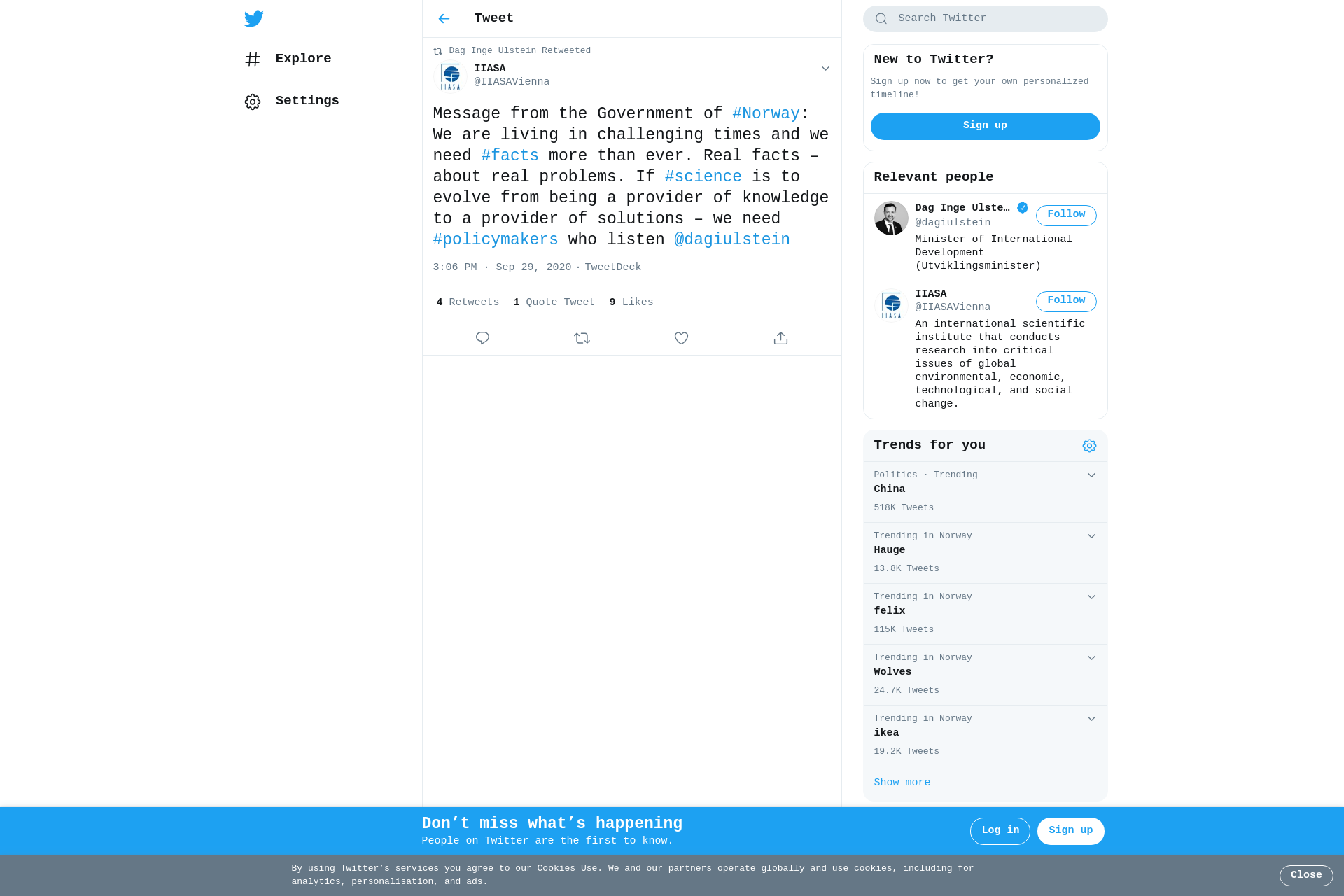 RT @IIASAVienna: Message from the Government of #Norway: We are living in challenging times and we need #facts more than ever. Real facts – about real problems. If #science is to evolve from being a provider of knowledge to a provider of solutions – we need #policymakers who listen @dagiulstein