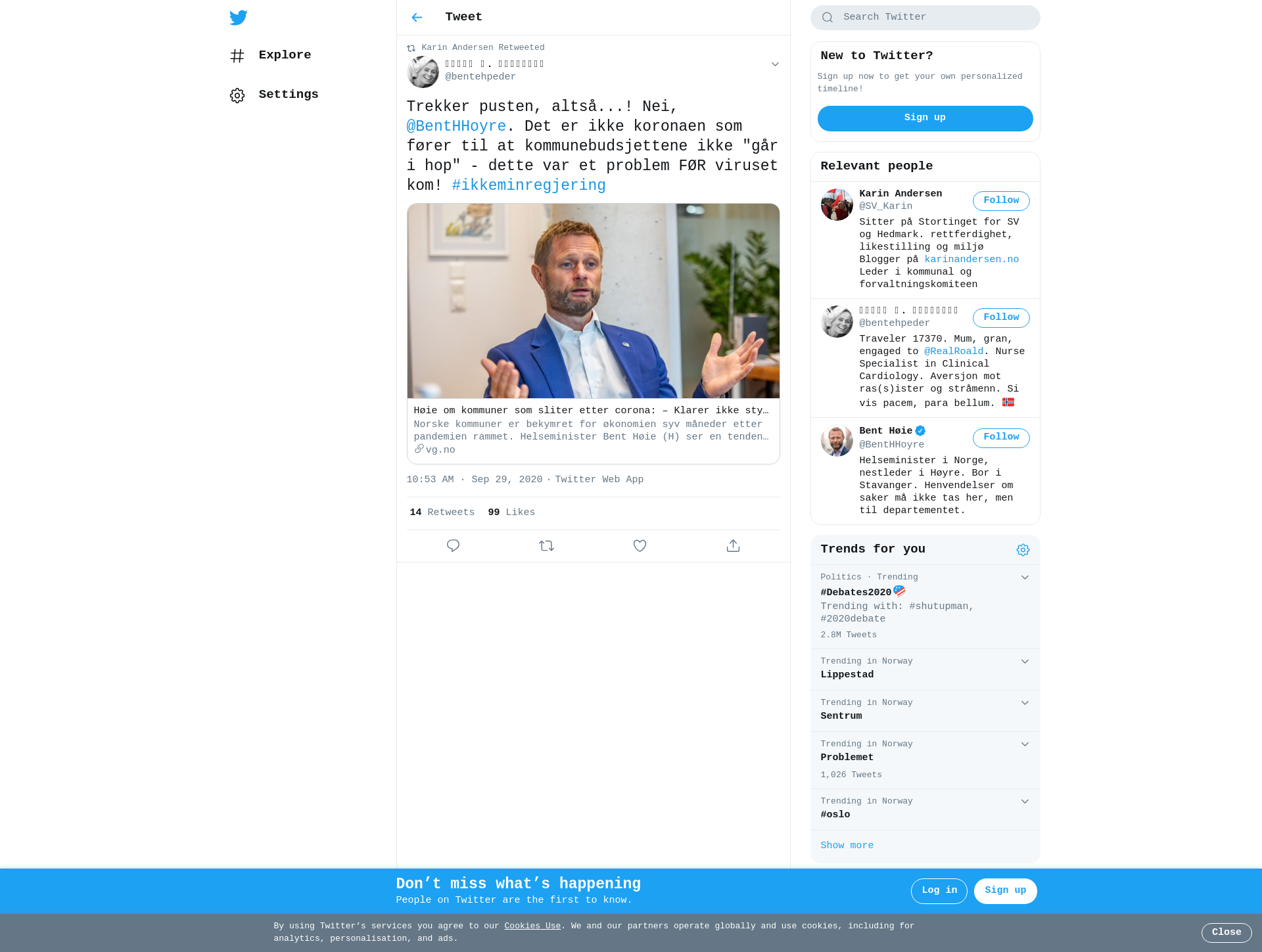 RT @bentehpeder: Trekker pusten, altså...! Nei, @BentHHoyre. Det er ikke koronaen som fører til at kommunebudsjettene ikke "går i hop" - dette var et problem FØR viruset kom! #ikkeminregjering https://t.co/nIO5JGCEKV