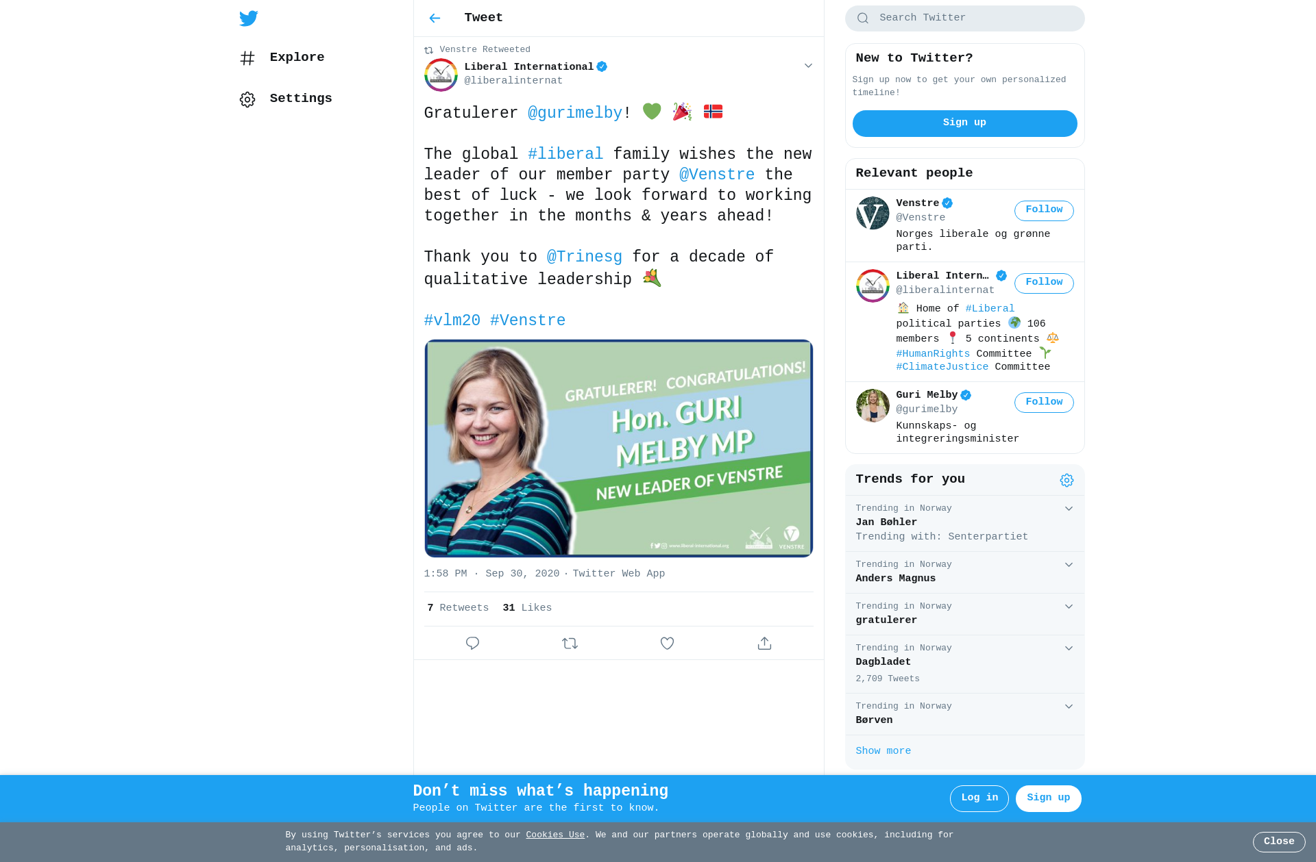 RT @liberalinternat: Gratulerer @gurimelby! 💚 🎉 🇳🇴 The global #liberal family wishes the new leader of our member party @Venstre the best…