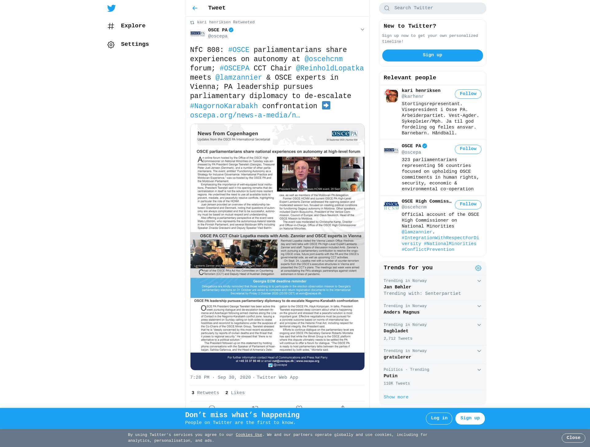 RT @oscepa: NfC 808: #OSCE parliamentarians share experiences on autonomy at @oscehcnm forum; #OSCEPA CCT Chair @ReinholdLopatka meets @lamzannier & OSCE experts in Vienna; PA leadership pursues parliamentary diplomacy to de-escalate #NagornoKarabakh confrontation ➡️ https://t.co/W4cUT0Y2H5 https://t.co/118GfA0ApN