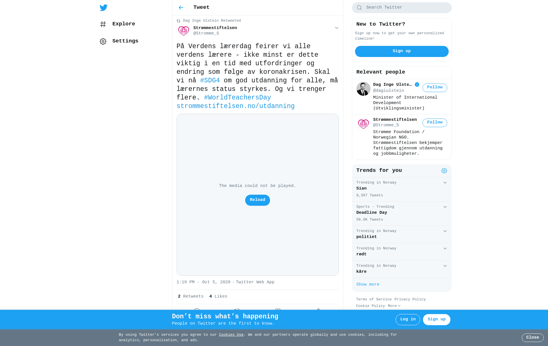 RT @Stromme_S: På Verdens lærerdag feirer vi alle verdens lærere - ikke minst er dette viktig i en tid med utfordringer og endring som følge av koronakrisen. Skal vi nå #SDG4 om god utdanning for alle, må lærernes status styrkes. Og vi trenger flere. #WorldTeachersDay https://t.co/z559E065pk https://t.co/3hwe7SZDen