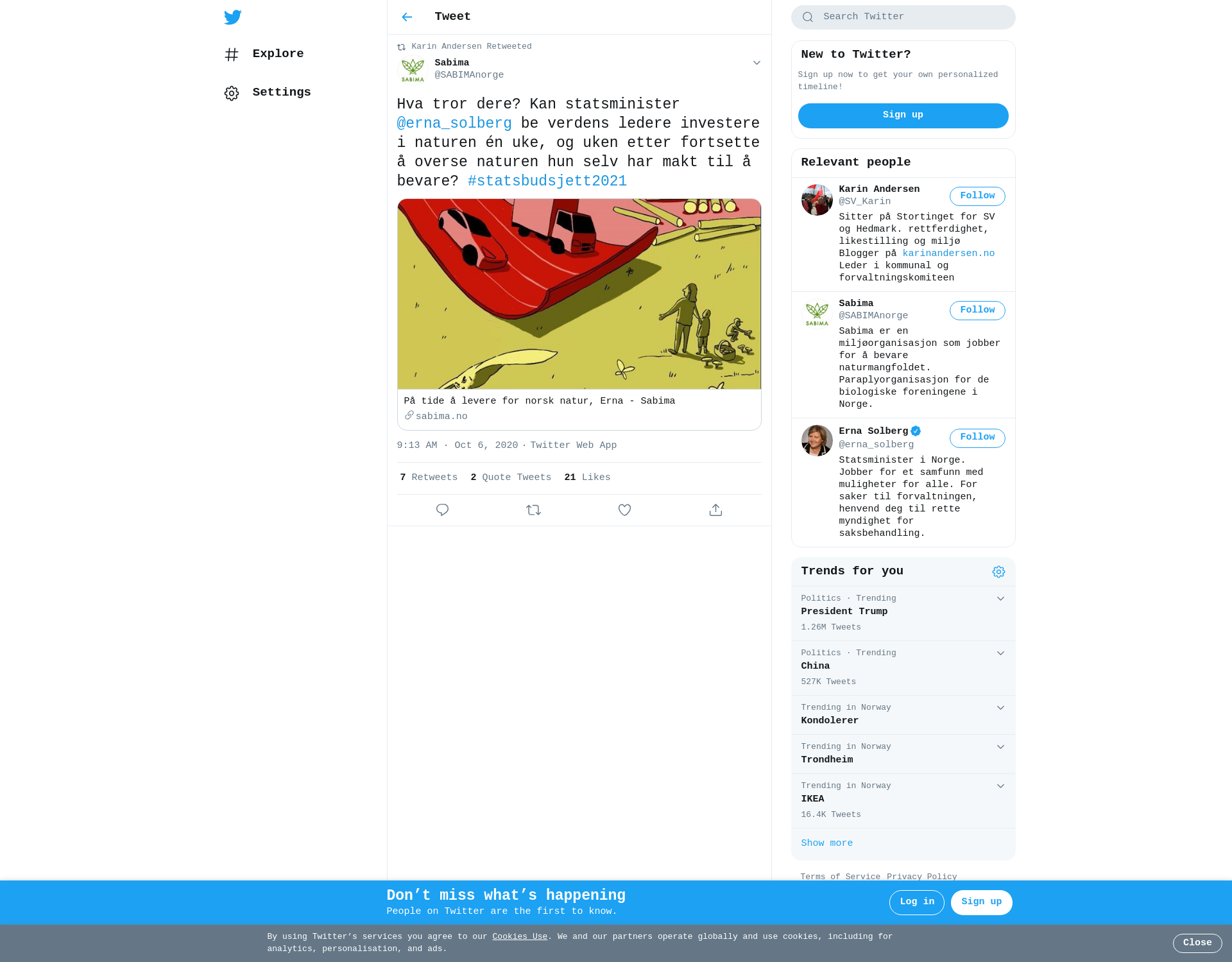 RT @SABIMAnorge: Hva tror dere? Kan statsminister @erna_solberg be verdens ledere investere i naturen én uke, og uken etter fortsette å overse naturen hun selv har makt til å bevare? #statsbudsjett2021