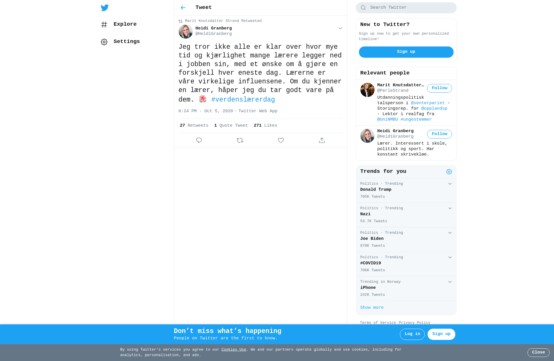 RT @HeidiGranberg: Jeg tror ikke alle er klar over hvor mye tid og kjærlighet mange lærere legger ned i jobben sin, med et ønske om å gjøre en forskjell hver eneste dag. Lærerne er våre virkelige influensene. Om du kjenner en lærer, håper jeg du tar godt vare på dem. 🌺 #verdenslærerdag