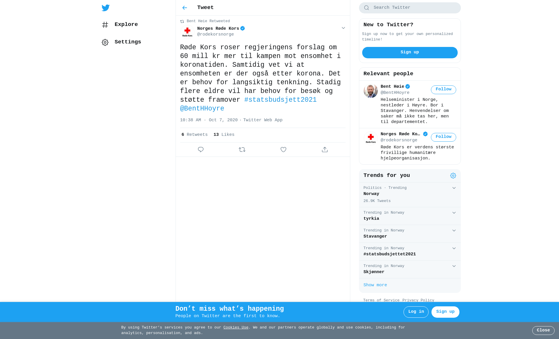 RT @rodekorsnorge: Røde Kors roser regjeringens forslag om 60 mill kr mer til kampen mot ensomhet i koronatiden. Samtidig vet vi at ensomheten er der også etter korona. Det er behov for langsiktig tenkning. Stadig flere eldre vil har behov for besøk og støtte framover #statsbudsjett2021 @BentHHoyre