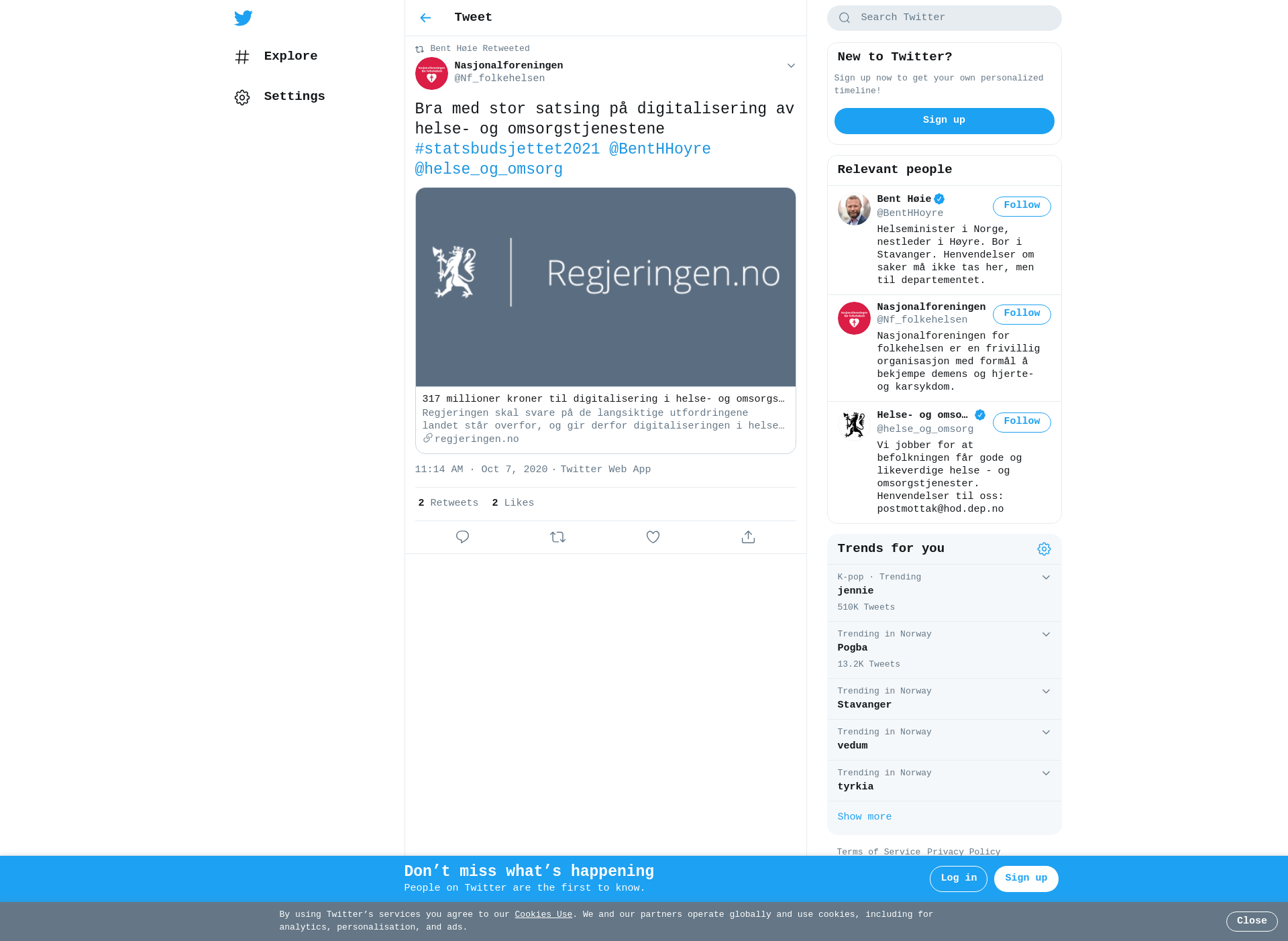 RT @Nf_folkehelsen: Bra med stor satsing på digitalisering av helse- og omsorgstjenestene #statsbudsjettet2021 @BentHHoyre @helse_og_omsorg https://t.co/nIdMceFYpi