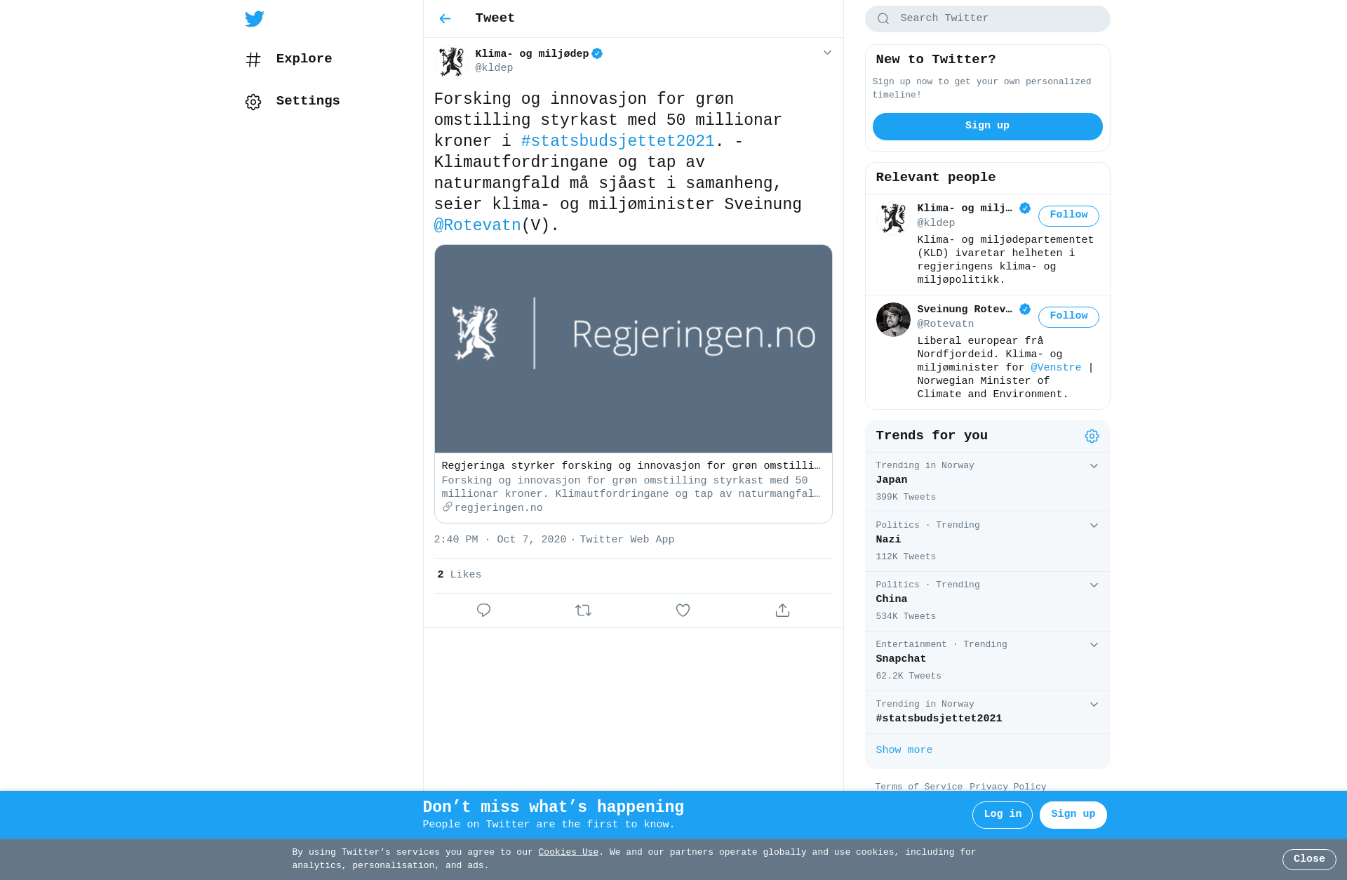 Forsking og innovasjon for grøn omstilling styrkast med 50 millionar kroner i #statsbudsjettet2021. -Klimautfordringane og tap av naturmangfald må sjåast i samanheng, seier klima- og miljøminister Sveinung @Rotevatn(V). https://t.co/Rgaq0PlkuE