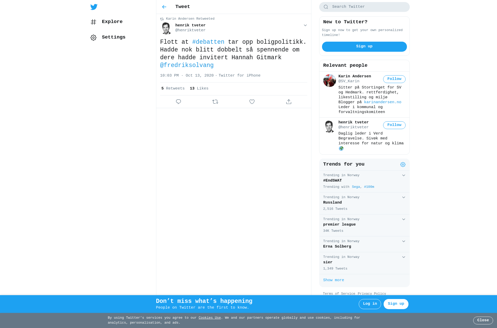 RT @henriktveter: Flott at #debatten tar opp boligpolitikk. Hadde nok blitt dobbelt så spennende om dere hadde invitert Hannah Gitmark @fredriksolvang