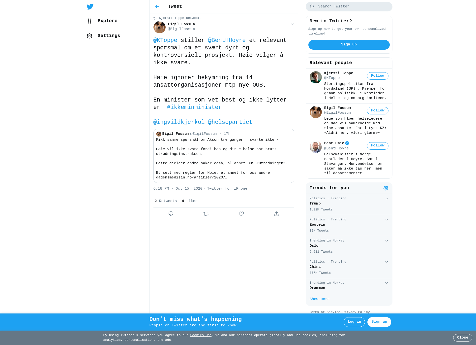 RT @EigilFossum: @KToppe stiller @BentHHoyre et relevant spørsmål om et svært dyrt og kontroversielt prosjekt. Høie velger å ikke svare.