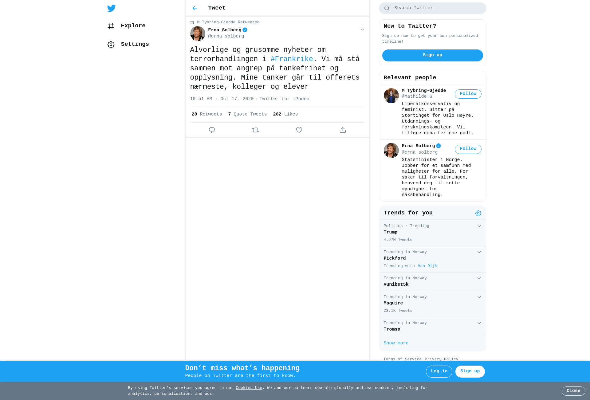 RT @erna_solberg: Alvorlige og grusomme nyheter om terrorhandlingen i #Frankrike. Vi må stå sammen mot angrep på tankefrihet og opplysning. Mine tanker går til offerets nærmeste, kolleger og elever