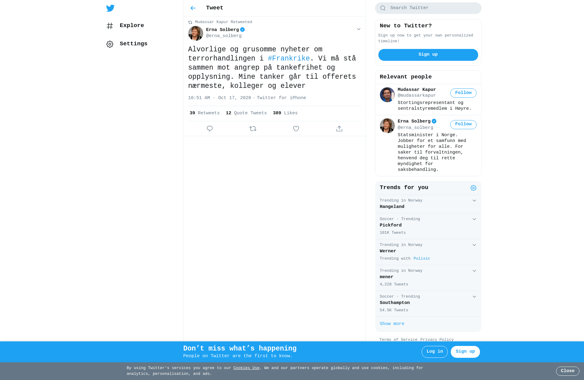 RT @erna_solberg: Alvorlige og grusomme nyheter om terrorhandlingen i #Frankrike. Vi må stå sammen mot angrep på tankefrihet og opplysning. Mine tanker går til offerets nærmeste, kolleger og elever