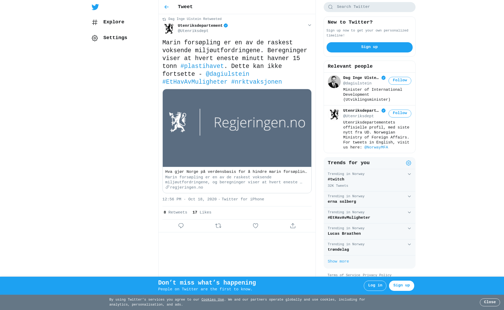 RT @Utenriksdept: Marin forsøpling er en av de raskest voksende miljøutfordringene. Beregninger viser at hvert eneste minutt havner 15 tonn #plastihavet. Dette kan ikke fortsette - @dagiulstein #EtHavAvMuligheter #nrktvaksjonen