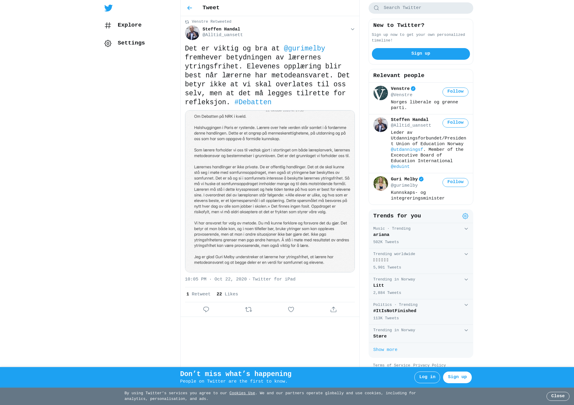 RT @Alltid_uansett: Det er viktig og bra at @gurimelby fremhever betydningen av lærernes ytringsfrihet. Elevenes opplæring blir best når lærerne har metodeansvaret. Det betyr ikke at vi skal overlates til oss selv, men at det må legges tilrette for refleksjon. #Debatten https://t.co/PLECoUpqra