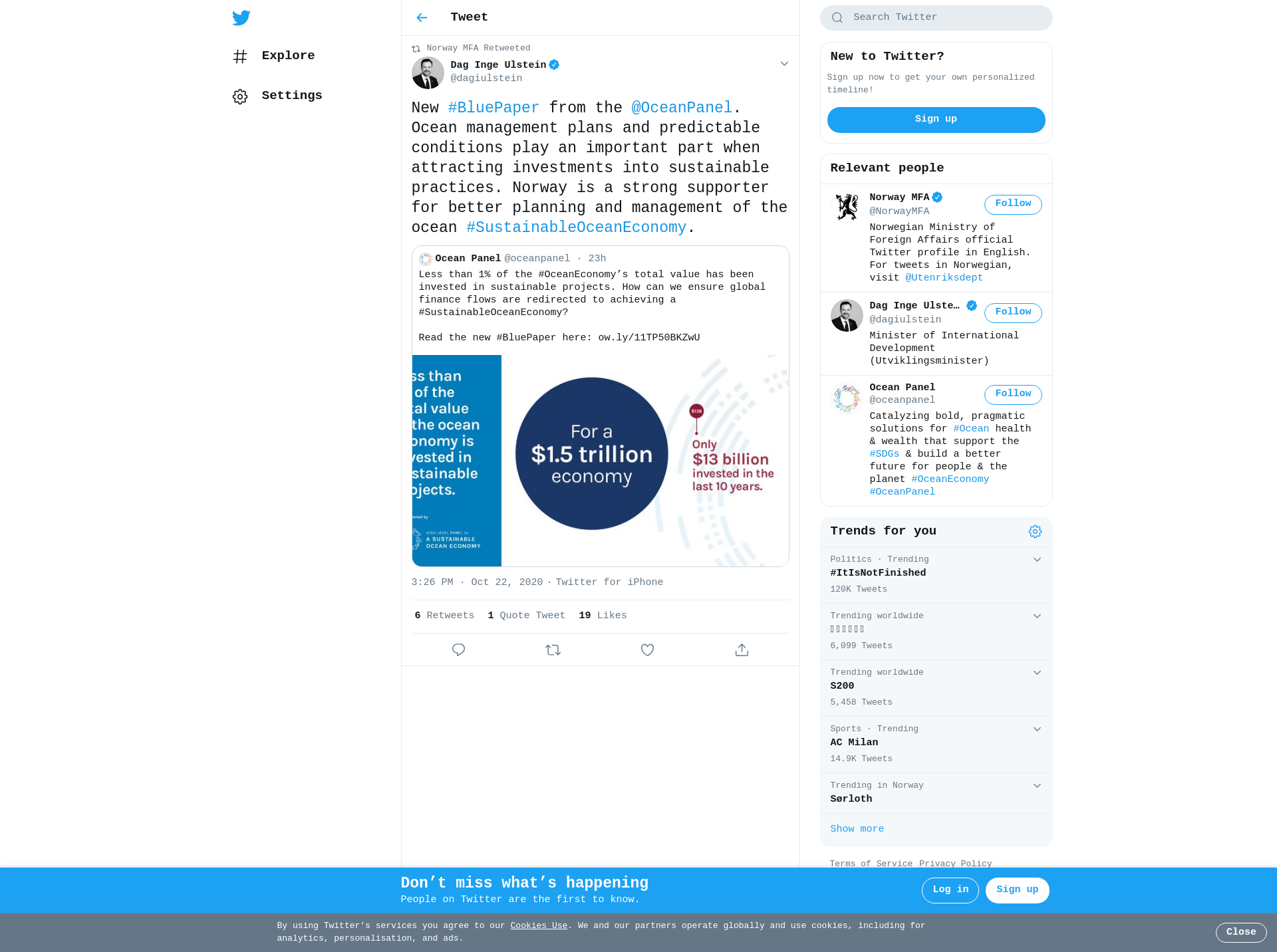 RT @dagiulstein: New #BluePaper from the @OceanPanel. Ocean management plans and predictable conditions play an important part when attracting investments into sustainable practices. Norway is a strong supporter for better planning and management of the ocean #SustainableOceanEconomy.