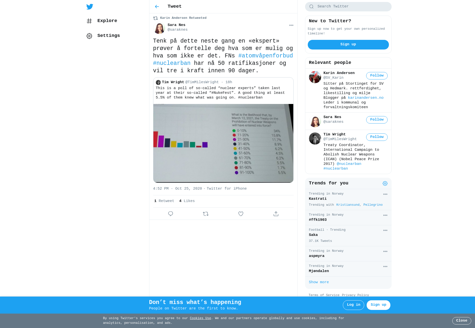 RT @saraknes: Tenk på dette neste gang en «ekspert» prøver å fortelle deg hva som er mulig og hva som ikke er det. FNs #atomvåpenforbud #nuclearban har nå 50 ratifikasjoner og vil tre i kraft innen 90 dager.