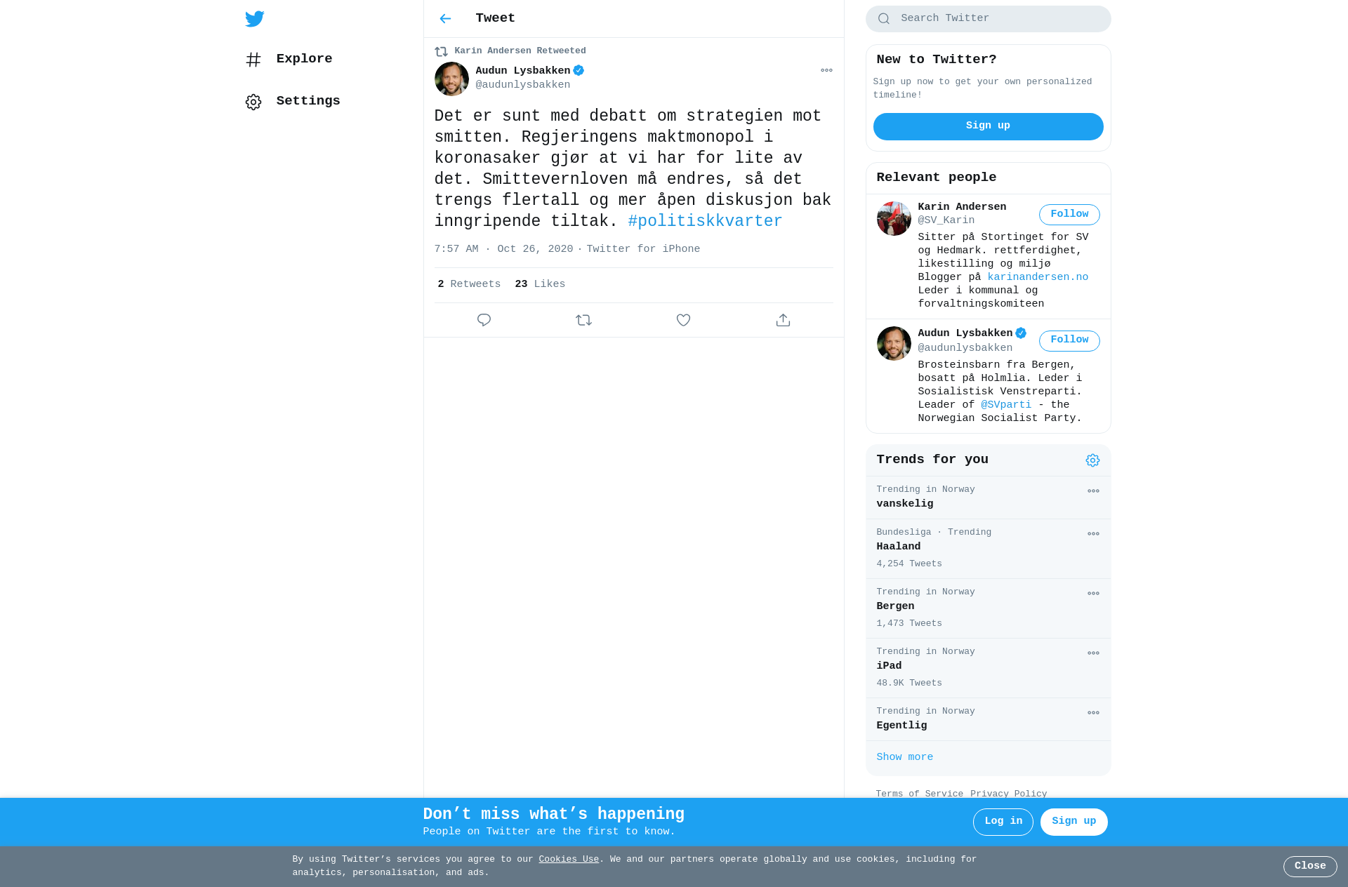 RT @audunlysbakken: Det er sunt med debatt om strategien mot smitten. Regjeringens maktmonopol i koronasaker gjør at vi har for lite av det. Smittevernloven må endres, så det trengs flertall og mer åpen diskusjon bak inngripende tiltak. #politiskkvarter