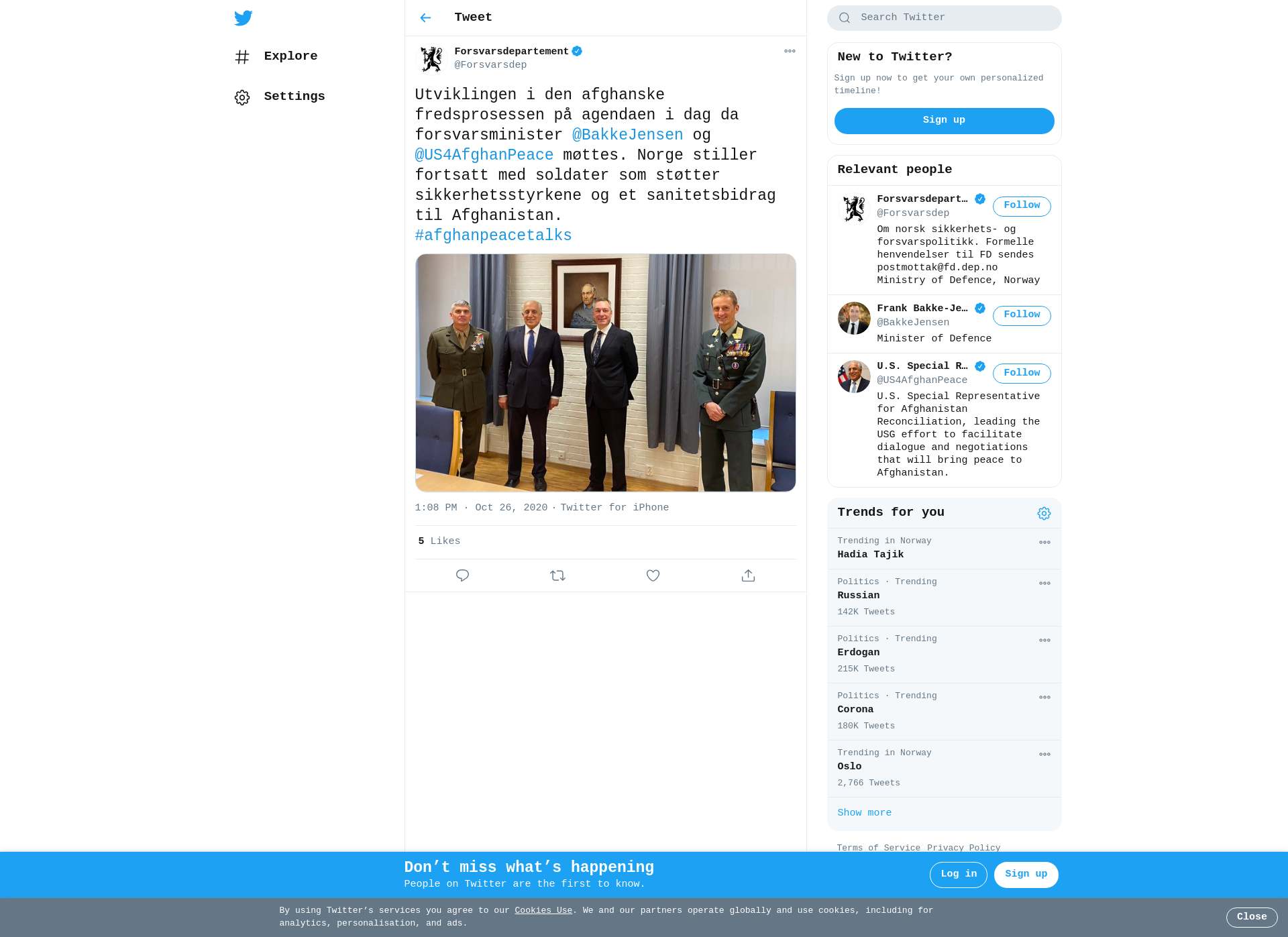 Utviklingen i den afghanske fredsprosessen på agendaen i dag da forsvarsminister @BakkeJensen og @US4AfghanPeace møttes. Norge stiller fortsatt med soldater som støtter sikkerhetsstyrkene og et sanitetsbidrag til Afghanistan.