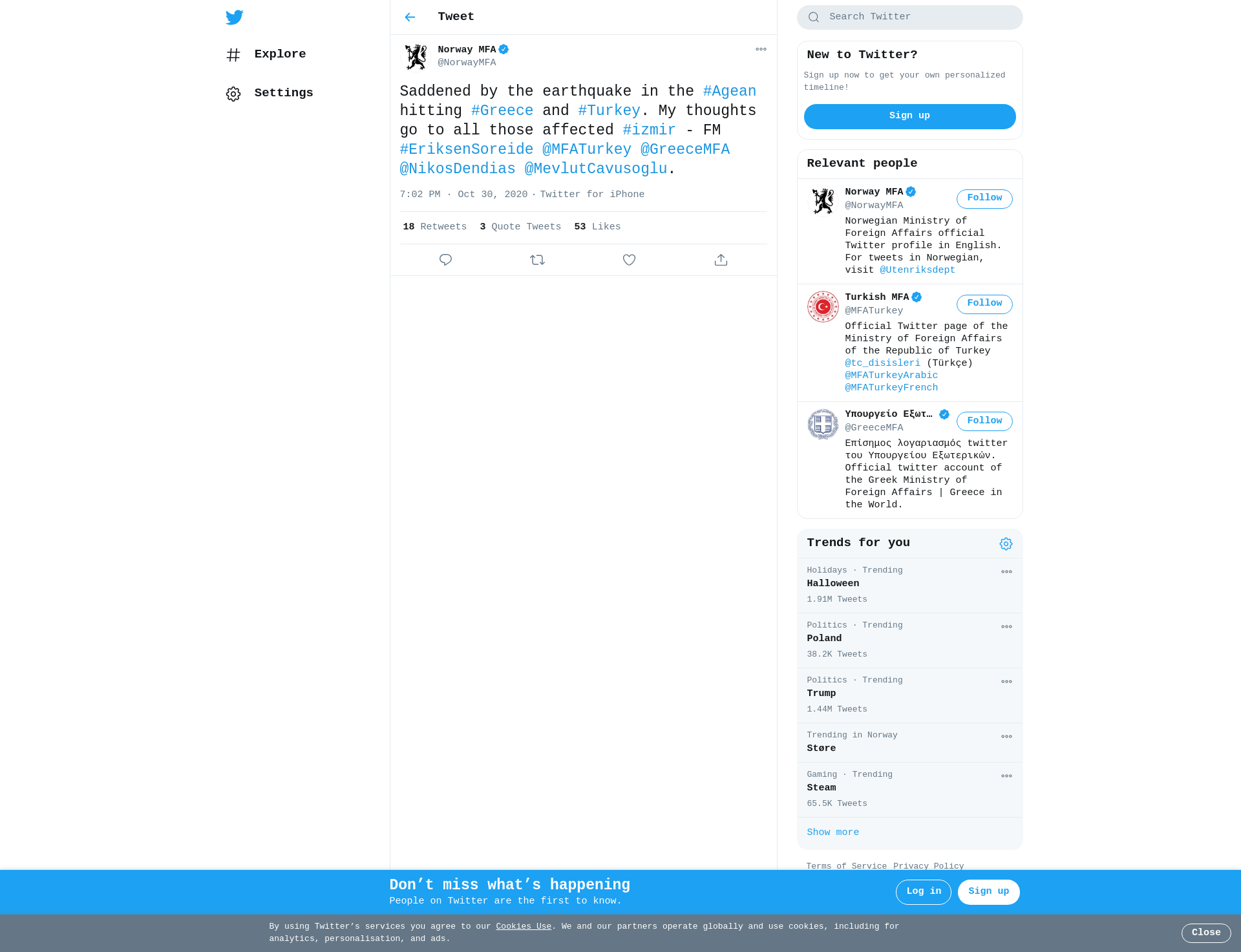 Saddened by the earthquake in the #Agean hitting #Greece and #Turkey. My thoughts go to all those affected #izmir - FM #EriksenSoreide @MFATurkey @GreeceMFA @NikosDendias @MevlutCavusoglu.