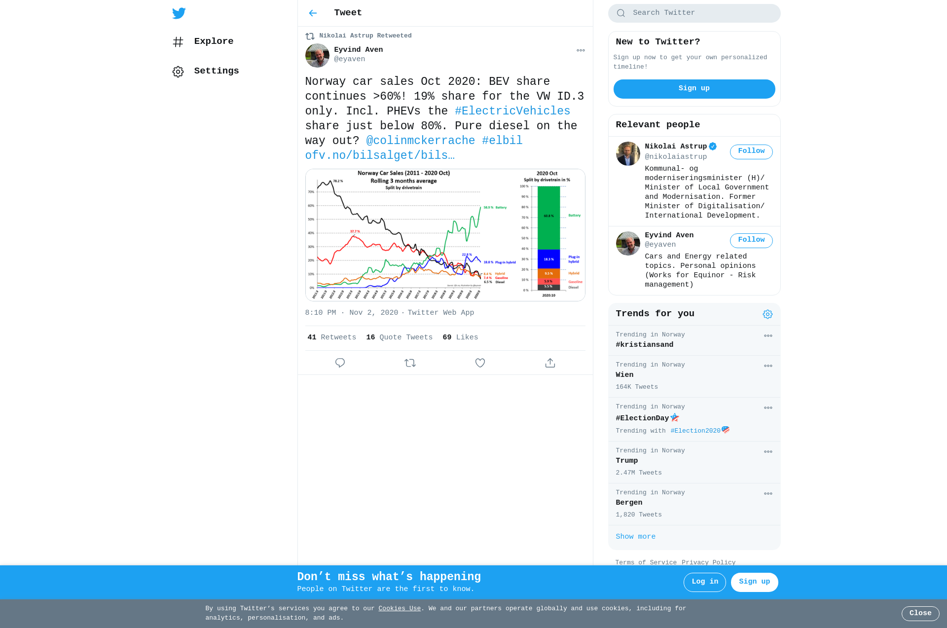 RT @eyaven: Norway car sales Oct 2020: BEV share continues >60%! 19% share for the VW ID.3 only. Incl. PHEVs the #ElectricVehicles share just below 80%. Pure diesel on the way out? @colinmckerrache #elbil https://t.co/Ruo356hI7h https://t.co/sR7KXlvGrE