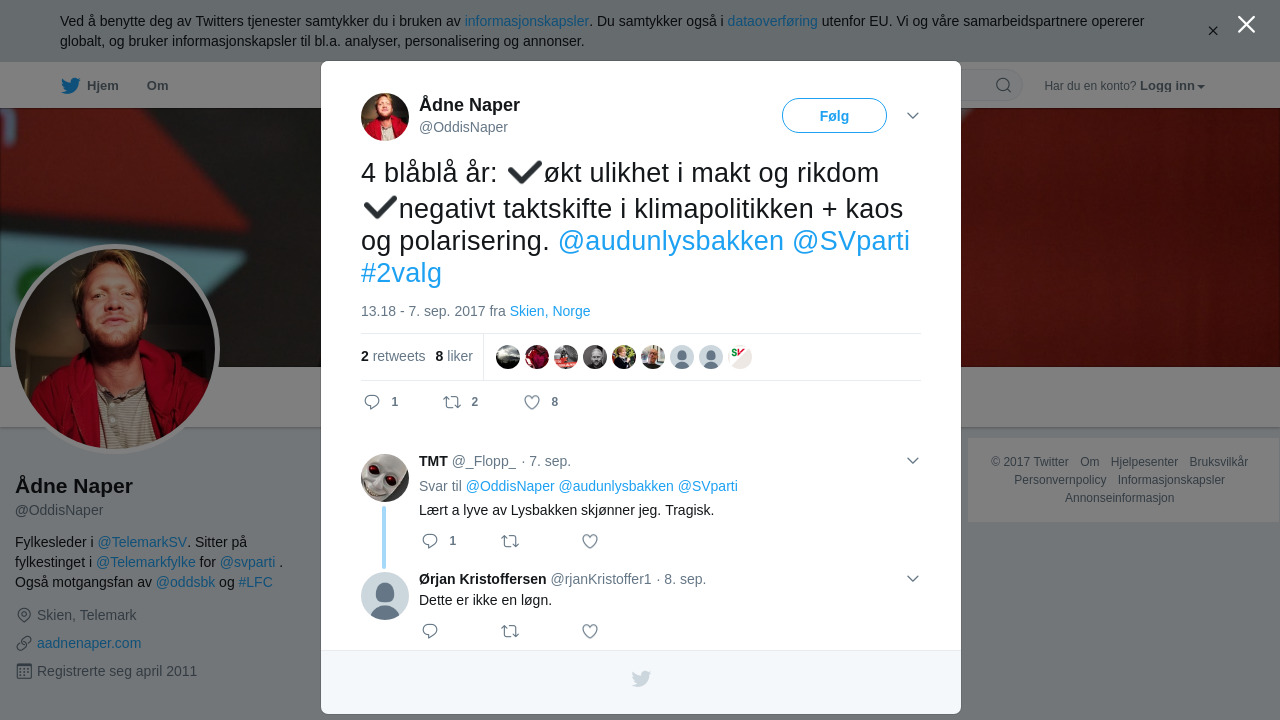 RT @OddisNaper: 4 blåblå år: ✔️økt ulikhet i makt og rikdom ✔️negativt taktskifte i klimapolitikken + kaos og polarisering. @audunlysbakken @SVparti #2valg