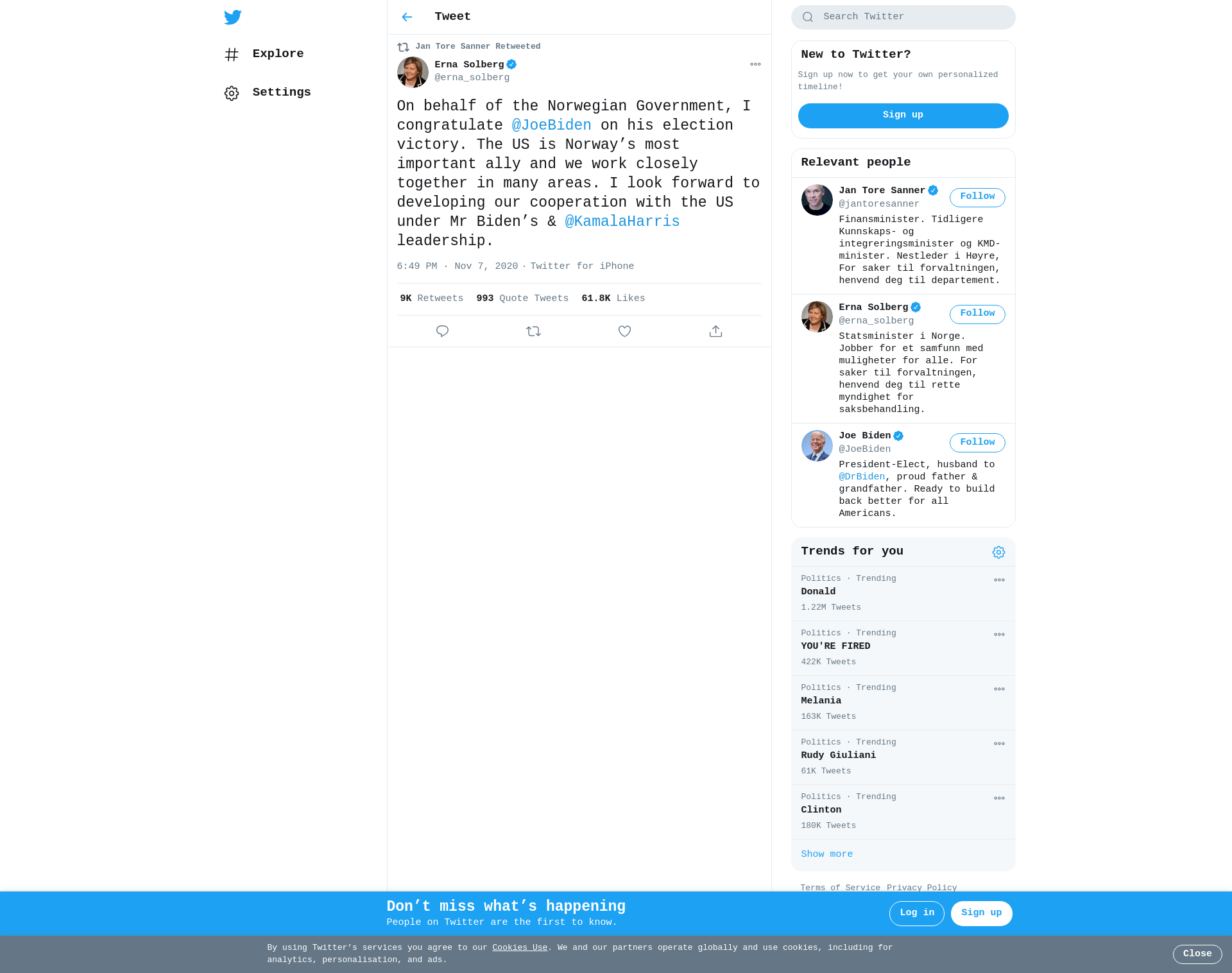 RT @erna_solberg: On behalf of the Norwegian Government, I congratulate @JoeBiden on his election victory. The US is Norway’s most important ally and we work closely together in many areas. I look forward to developing our cooperation with the US under Mr Biden’s & @KamalaHarris leadership.