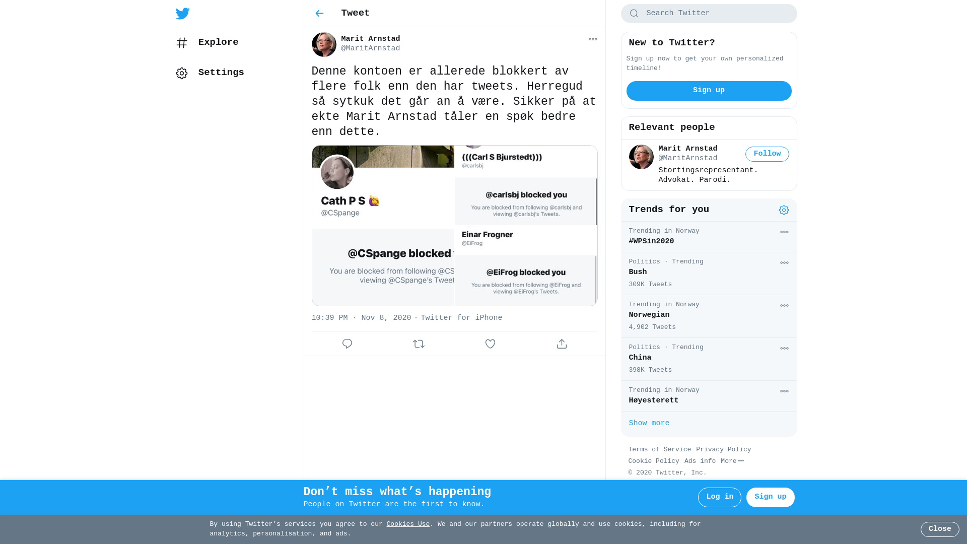 Denne kontoen er allerede blokkert av flere folk enn den har tweets. Herregud så sytkuk det går an å være. Sikker på at ekte Marit Arnstad tåler en spøk bedre enn dette. https://t.co/NN9IBzJf41
