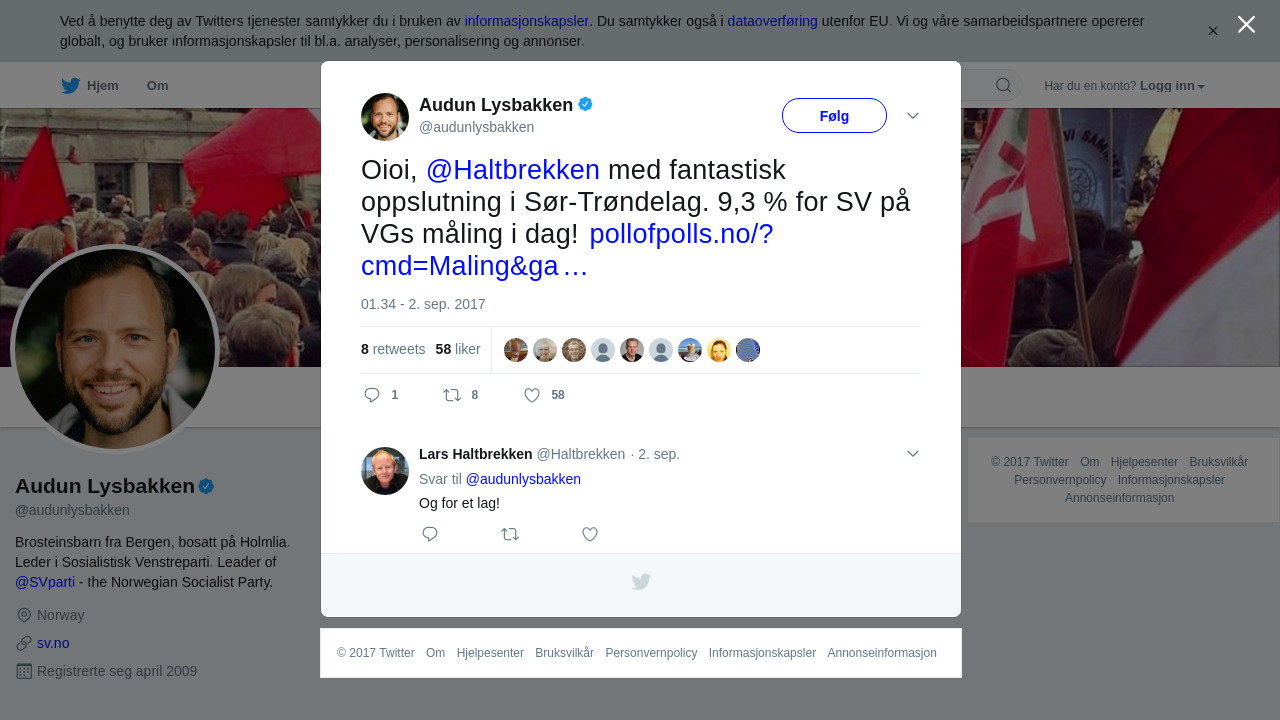 RT @audunlysbakken: Oioi, @Haltbrekken med fantastisk oppslutning i Sør-Trøndelag. 9,3 % for SV på VGs måling i dag! https://t.co/zSvGv78VhL