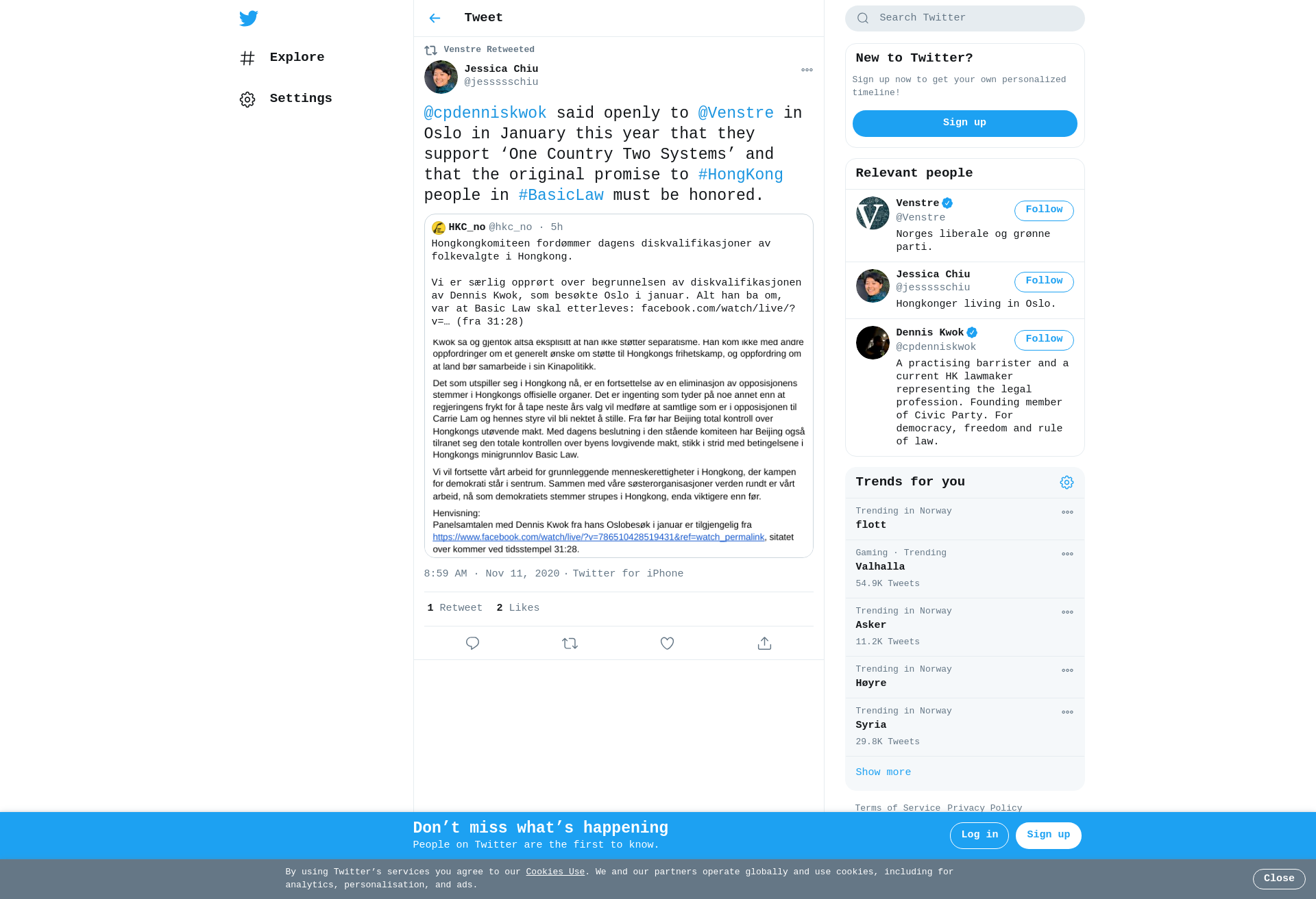 RT @jessssschiu: @cpdenniskwok said openly to @Venstre in Oslo in January this year that they support ‘One Country Two Systems’ and that the original promise to #HongKong people in #BasicLaw must be honored.