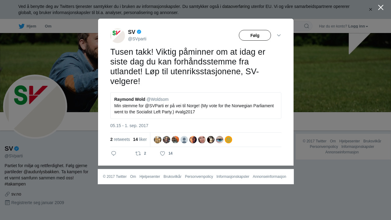 “Min stemme for @SVParti er på vei til Norge! (My vote for the Norwegian Parliament went to the Socialist Left Party.) #valg2017”