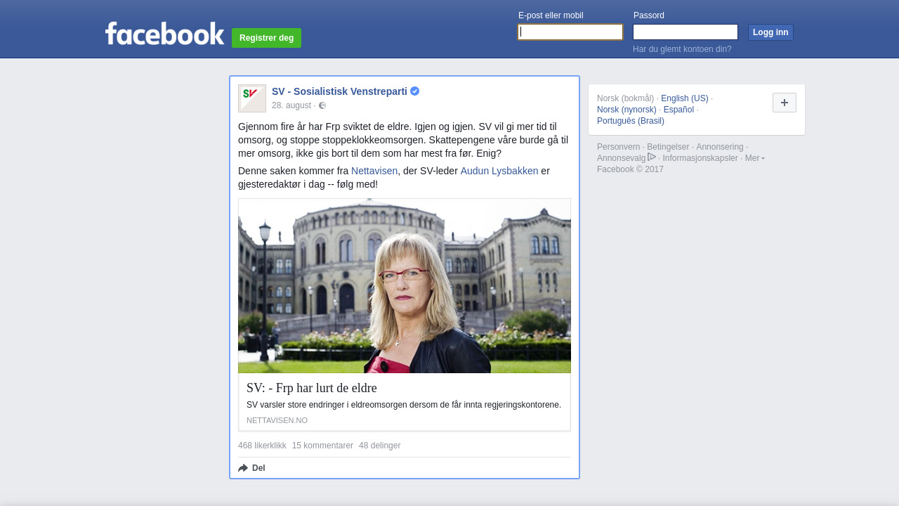Gjennom fire år har Frp sviktet de eldre. Igjen og igjen. SV vil gi mer tid til omsorg, og stoppe stoppeklokkeomsorgen. Skattepengene våre burde gå til mer omsorg, ikke gis bort til dem som har mest fra før. Enig?