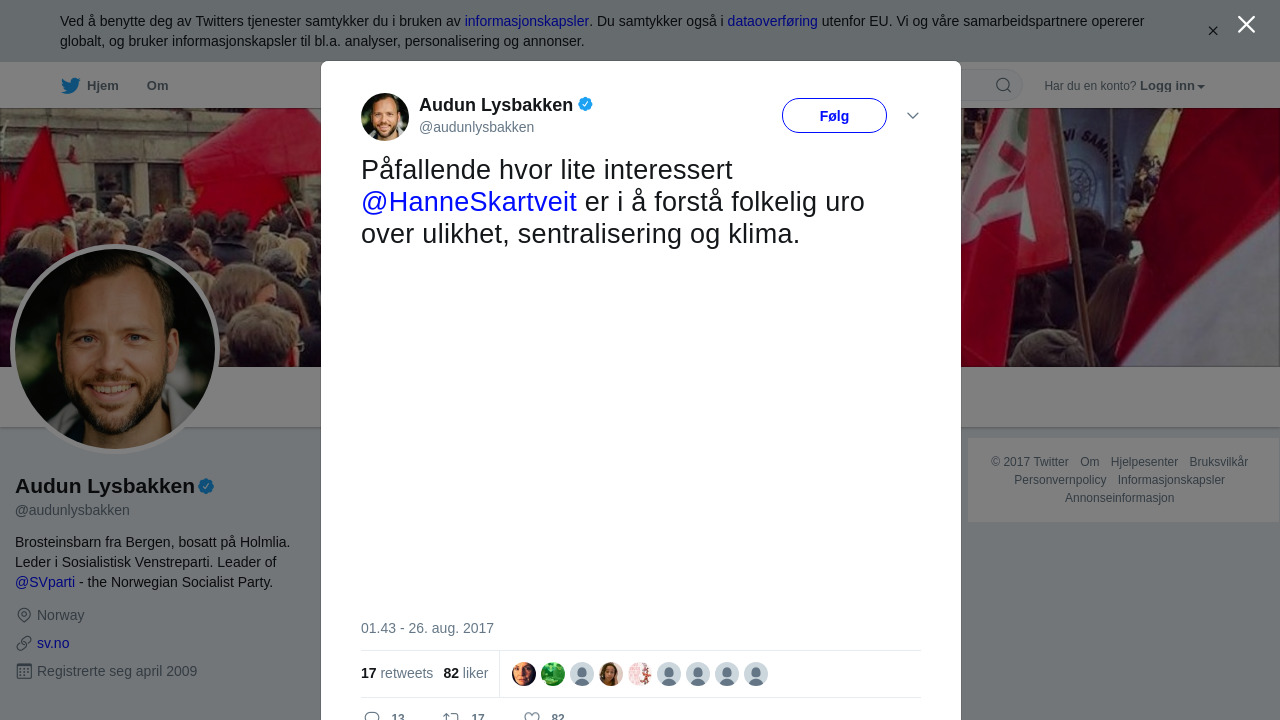 RT @audunlysbakken: Påfallende hvor lite interessert @HanneSkartveit er i å forstå folkelig uro over ulikhet, sentralisering og klima. https://t.co/rVcT9yCdCH