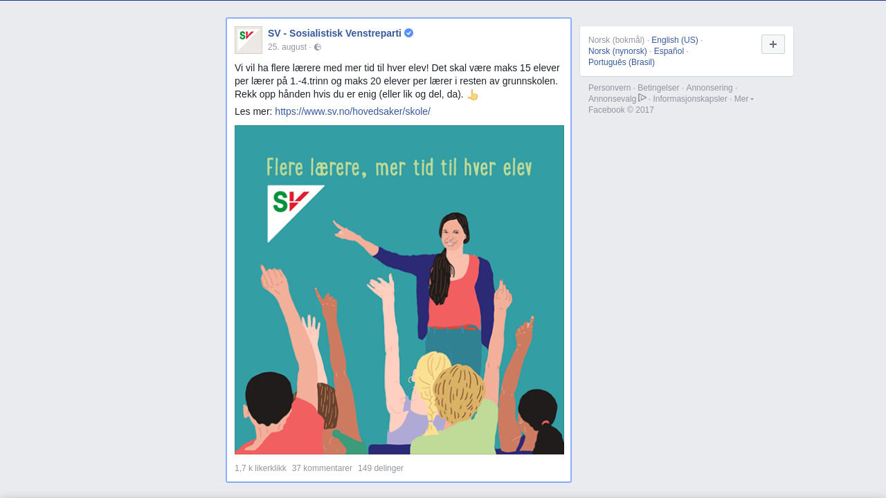 Vi vil ha flere lærere med mer tid til hver elev! Det skal være maks 15 elever per lærer på 1.-4.trinn og maks 20 elever per lærer i resten av grunnskolen. Rekk opp hånden hvis du er enig (eller lik og del, da). 👆