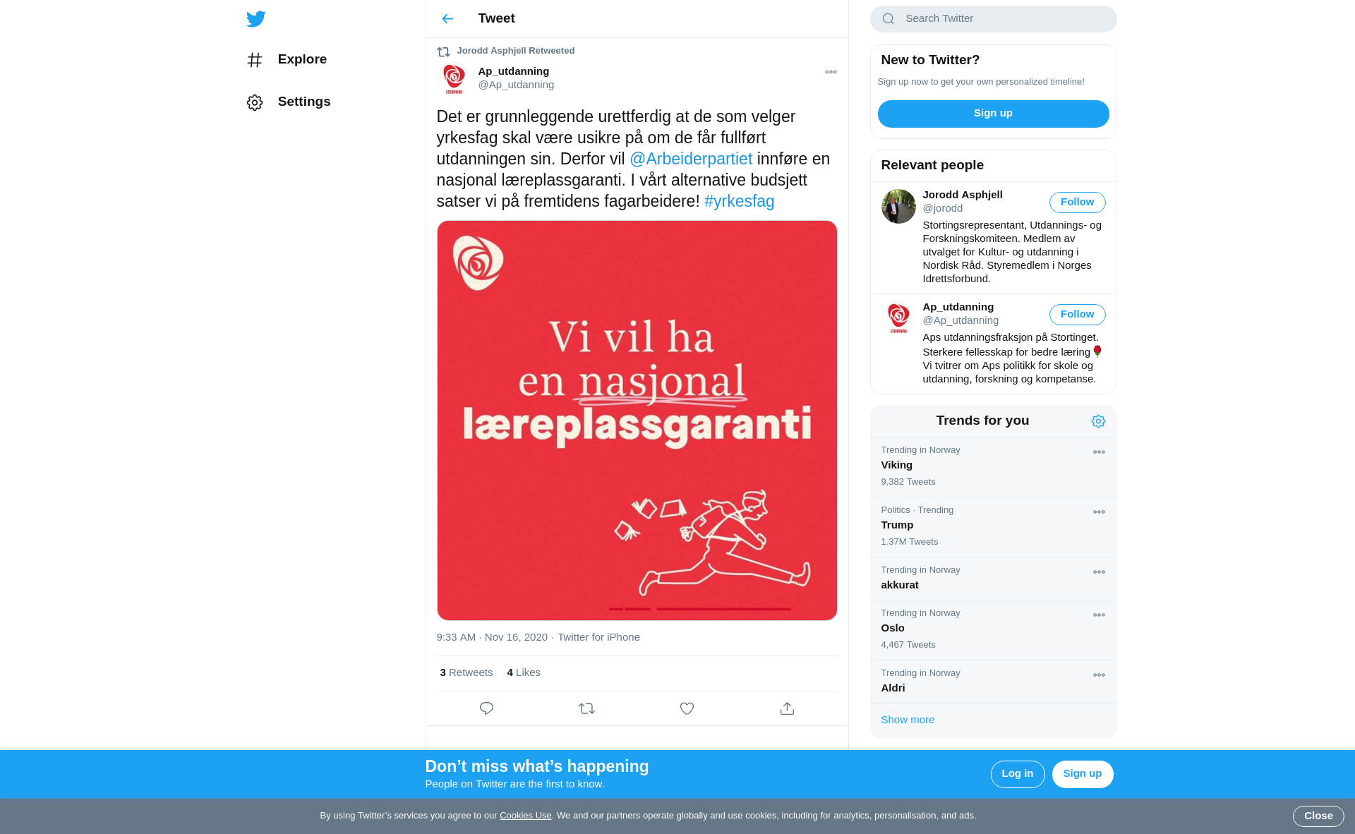 RT @Ap_utdanning: Det er grunnleggende urettferdig at de som velger yrkesfag skal være usikre på om de får fullført utdanningen sin. Derfor vil @Arbeiderpartiet innføre en nasjonal læreplassgaranti. I vårt alternative budsjett satser vi på fremtidens fagarbeidere! #yrkesfag https://t.co/N0ZOPd4Ev0