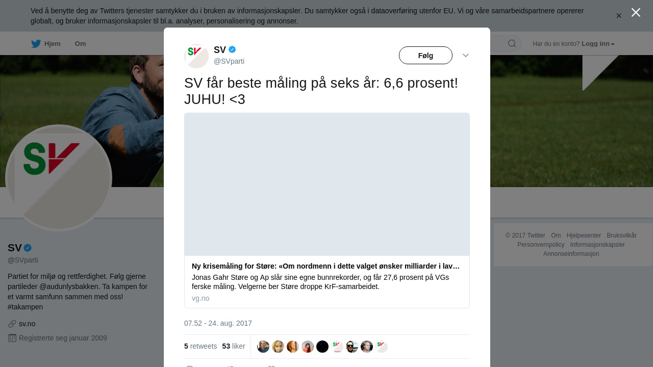 SV får beste måling på seks år: 6,6 prosent! JUHU! <3 https://t.co/6EMJddU2WA