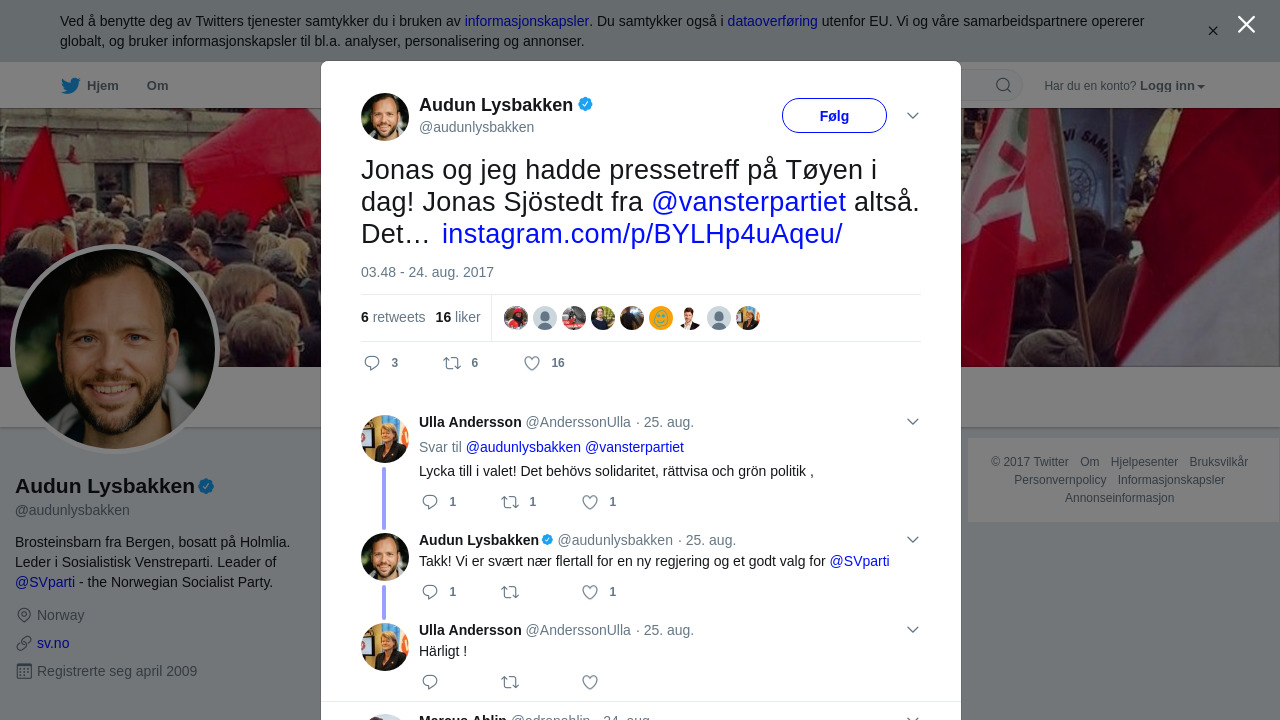 RT @audunlysbakken: Jonas og jeg hadde pressetreff på Tøyen i dag! Jonas Sjöstedt fra @vansterpartiet altså. Det… https://t.co/T2habyyJDO