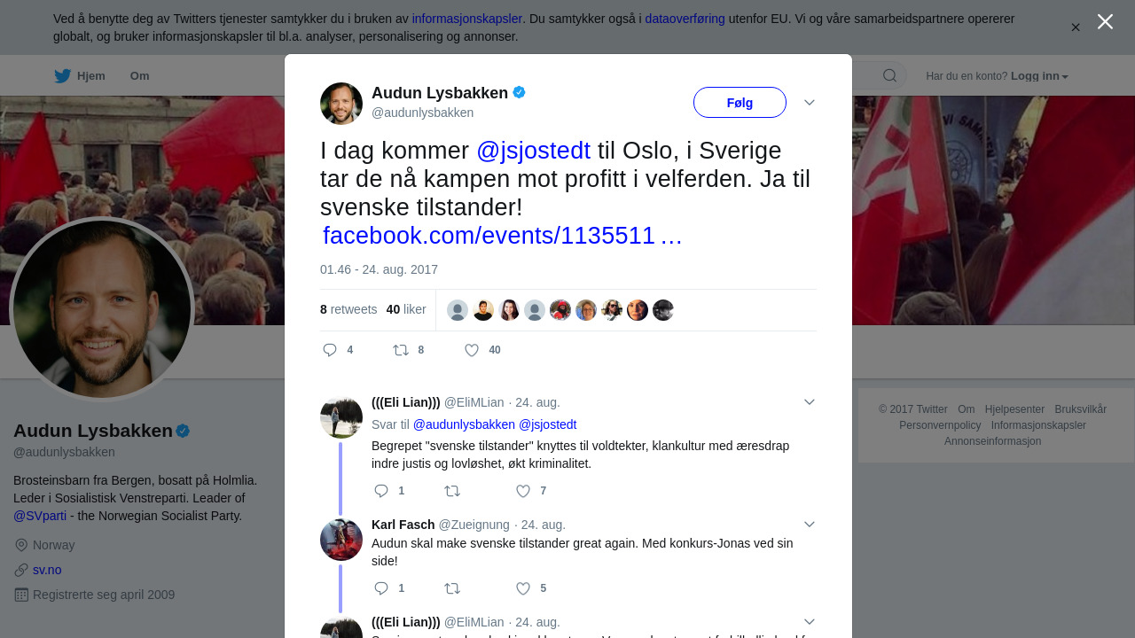 RT @audunlysbakken: I dag kommer @jsjostedt til Oslo, i Sverige tar de nå kampen mot profitt i velferden. Ja til svenske tilstander! https://t.co/UGGa5tKm0R