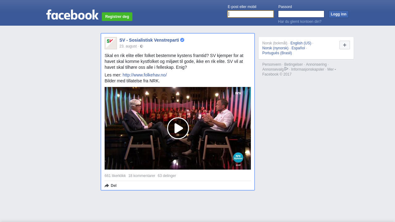 Skal en rik elite eller folket bestemme kystens framtid? SV kjemper for at havet skal komme kystfolket og miljøet til gode, ikke en rik elite. SV vil at havet skal tilhøre oss alle i felleskap. Enig?