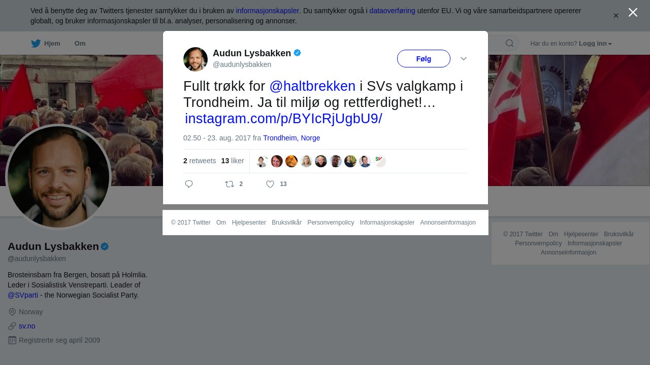 0 Likes, 1 Comments - Audun Lysbakken (@audunlysbakken) on Instagram: “Fullt trøkk for @haltbrekken i SVs valgkamp i Trondheim. Ja til miljø og rettferdighet! #takampen”